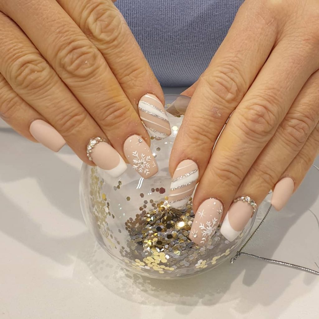 Soft nude tones decorated with delicate snowflakes and silver stripes create a manicure that feels both cozy and elegant. The matte finish adds a classy holidays vibe, while the subtle rhinestone accents catch the light like winter frost. It’s the perfect balance of simple and festive, ideal for women who want a seasonal look that’s graceful rather than loud.