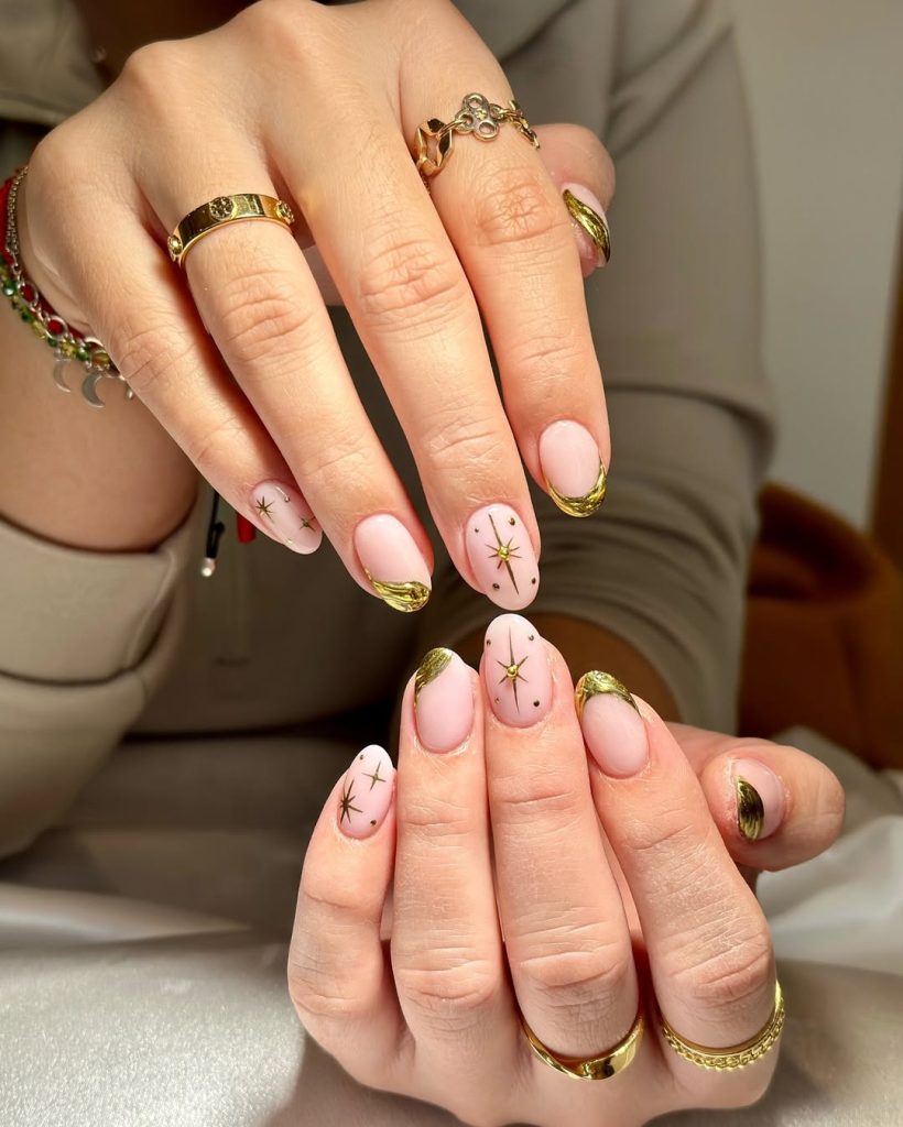 If Christmas magic could be bottled, it would look like this. Golden French tips blend seamlessly into a nude base, while delicate stars and dots shimmer across each nail. The result is glamorous yet playful, giving off the energy of a starry holiday night. It’s festive art that feels classy and chic at the same time.