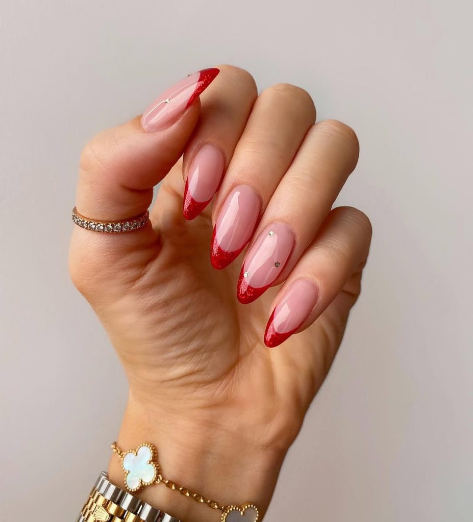 Classic red gets a festive upgrade with glittery French tips that sparkle with every move. The almond shape elongates the hand, while tiny rhinestone accents add a subtle touch of winter glamour. This design embodies classy holidays red style while staying polished and modern.