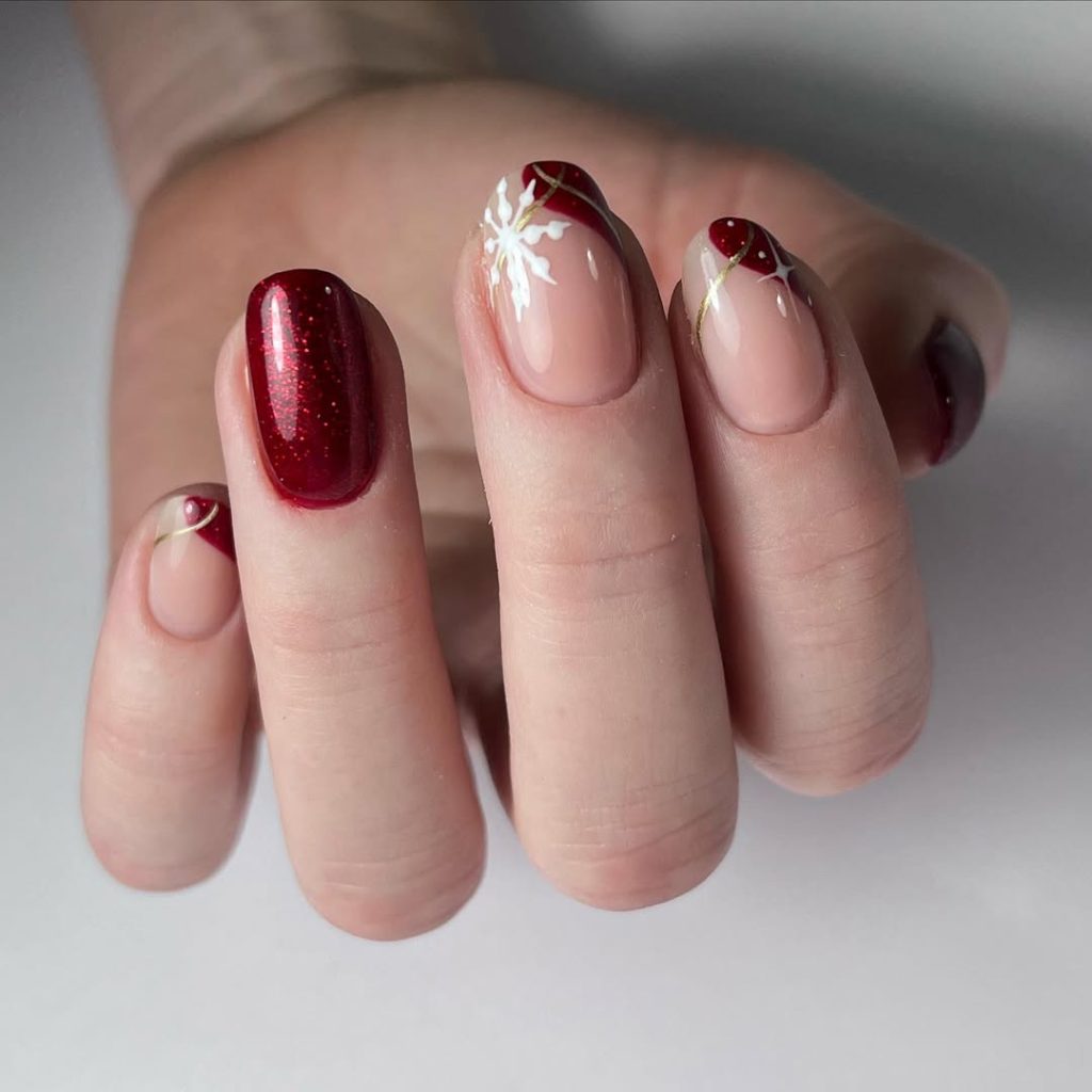 Deep red glitter nails paired with nude bases decorated in festive accents give this manicure a bold yet classy feel. The addition of white snowflakes and golden lines makes the whole set come alive, almost like Christmas ornaments captured in nail art. It’s playful, chic, and perfectly designed to add holiday cheer in a sophisticated way.