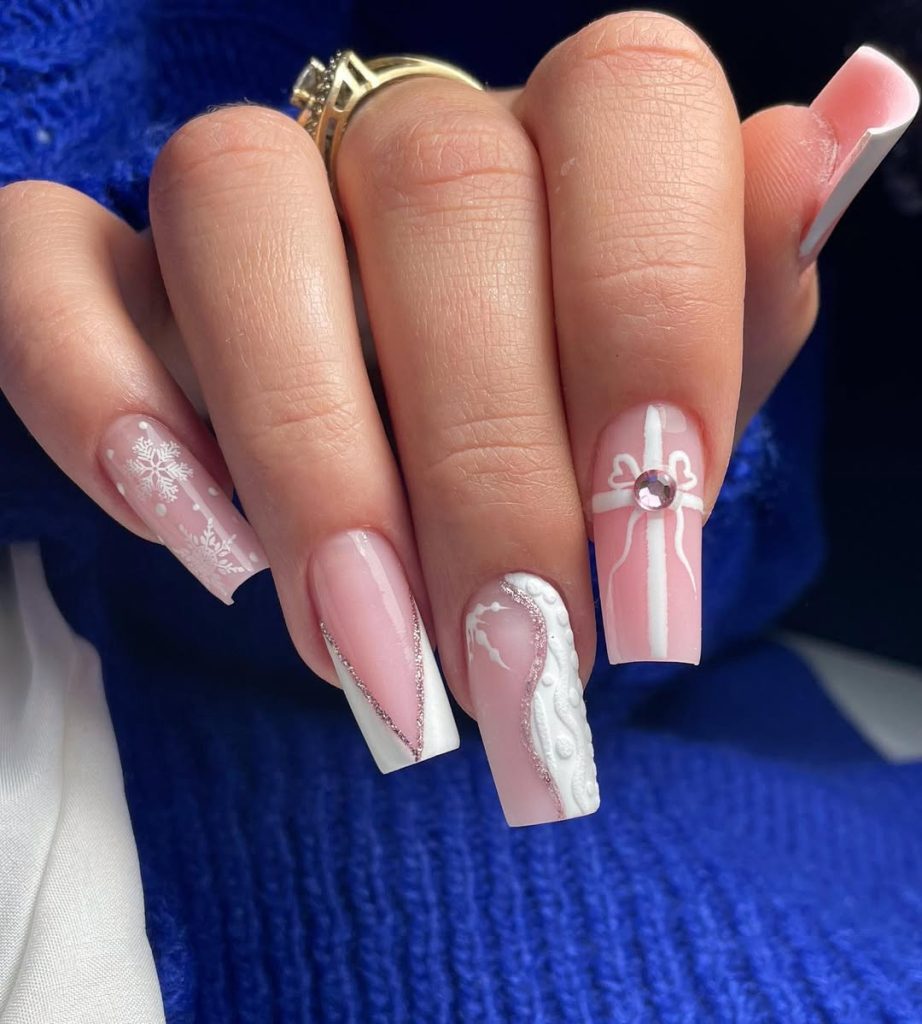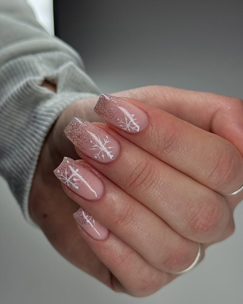 Soft pink bases layered with delicate white snowflake designs and glittered tips give a feminine and festive imprint. The glimmer is just right-as in, it spritzes a little sparkle on the design without overpowering it. The look is classy and balanced for women who appreciate subtle holiday beauty.