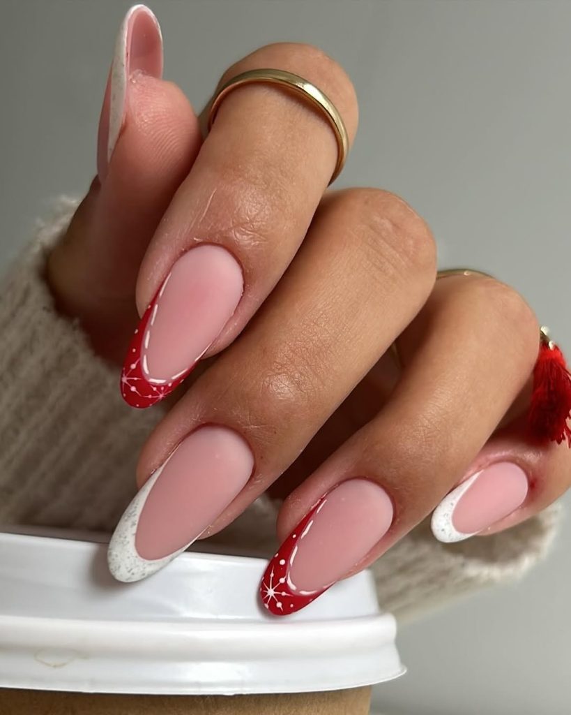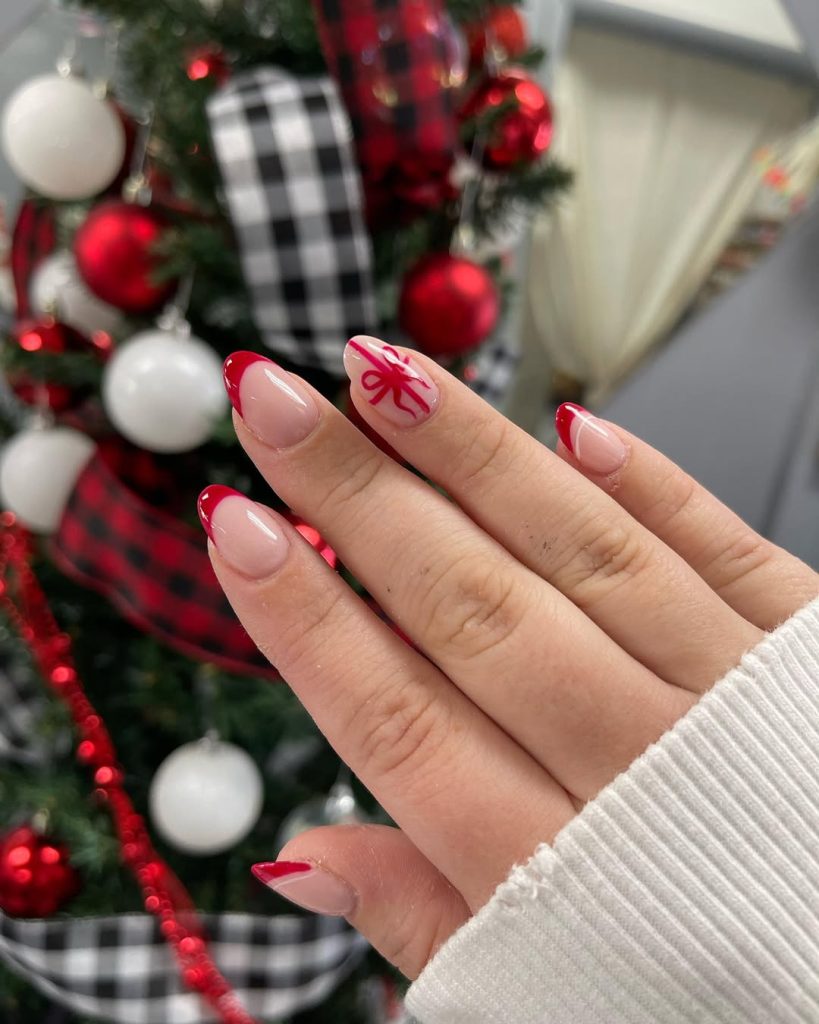 This design suits women who love almond nails with a playful edge. The combination of red and winter white gives it a timeless holiday feel, making it one of the most versatile classy holidays designs for 2025. Perfect for cozy gatherings or glamorous nights out, this look embodies festive elegance.