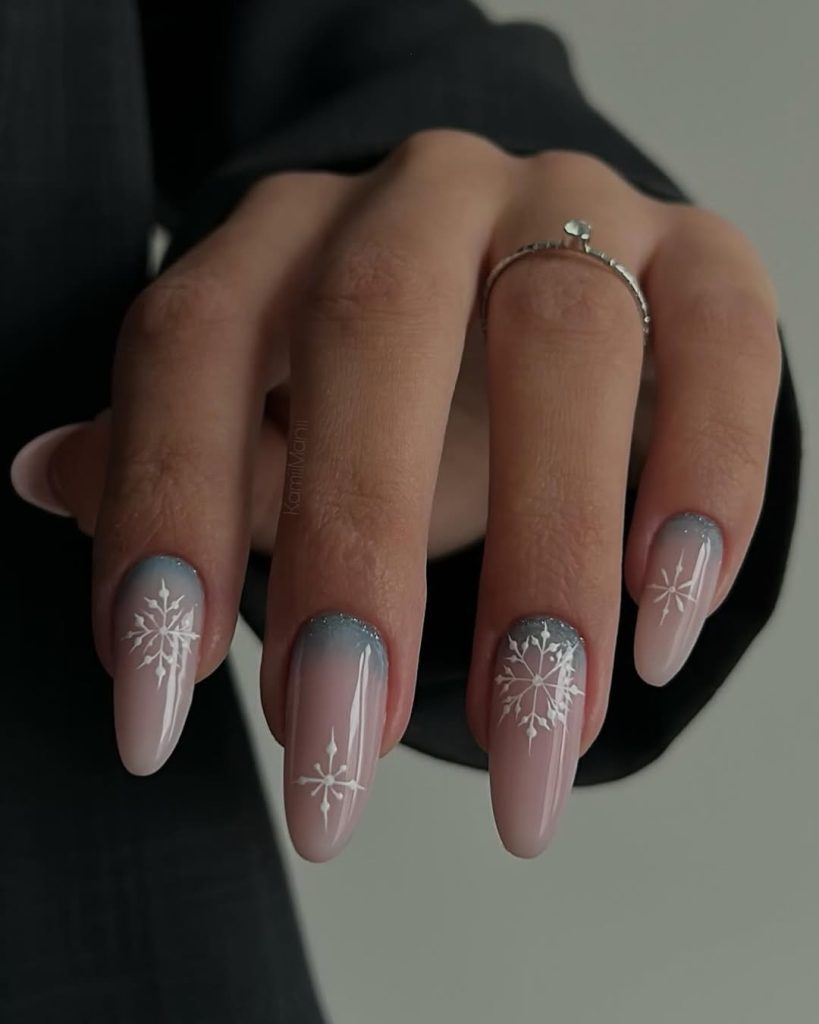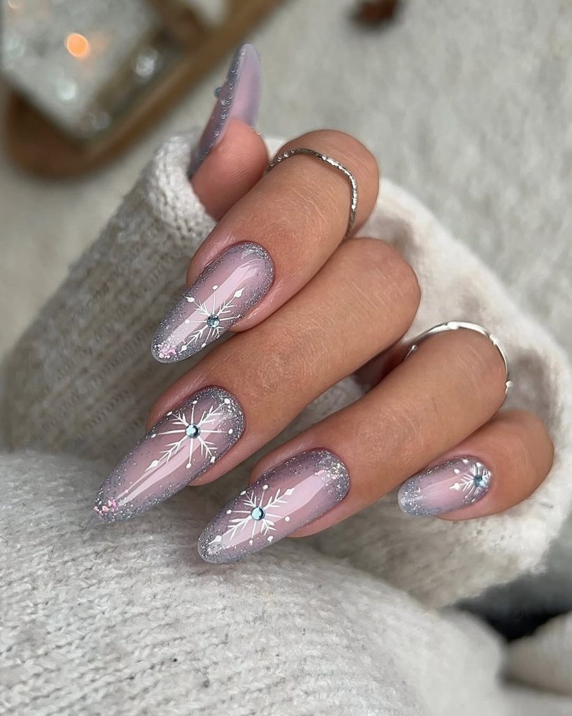 Sparkling silver gradients frame delicate snowflake details in this dreamy manicure. The overall look is glamorous and winter-inspired, with crystal accents adding an extra layer of festive sparkle. It’s a manicure that feels magical, perfect for classy holidays sparkle nights out.