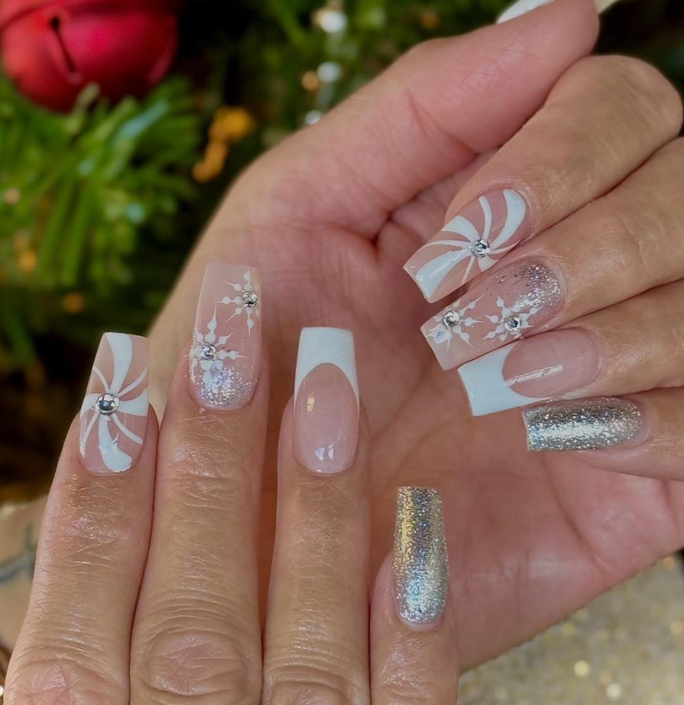 If holiday magic could be captured in a manicure, this would be it. Crisp white candy-cane swirls, glittering silver accents, and delicate snowflake details come together on a chic square shape that feels both playful and sophisticated. The overall effect is elegant, fresh, and full of classy holidays sparkle, the kind of manicure that makes you want to show off every detail.