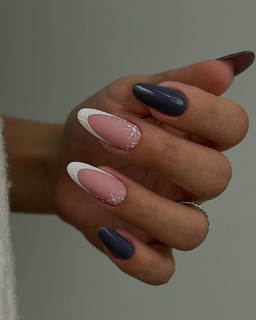 Melding deep navy with light nude tones, white French tips decorated with delicate stars give this manicure a striking yet graceful contrast. Perfect for those who cherish a blend of tradition and trend, classically modern yet immaculately festive — a design set to conjure images of wintery nights aglow with starlight.