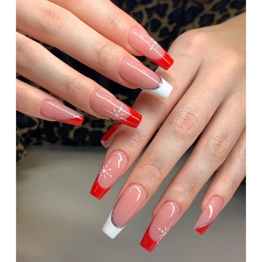 This manicure is all about high-impact festive glamour. Bright red French tips mixed with crisp white accents create a bold, confident look. Subtle star details add a touch of winter magic, making this design a modern twist on a holiday classic.