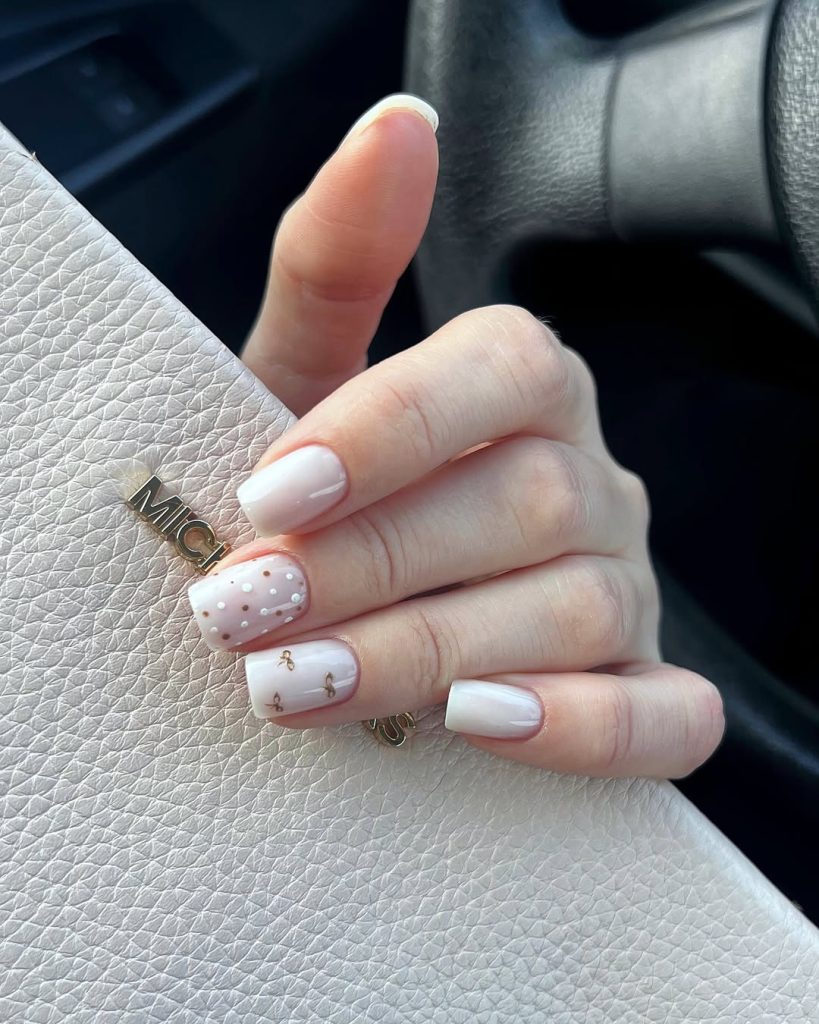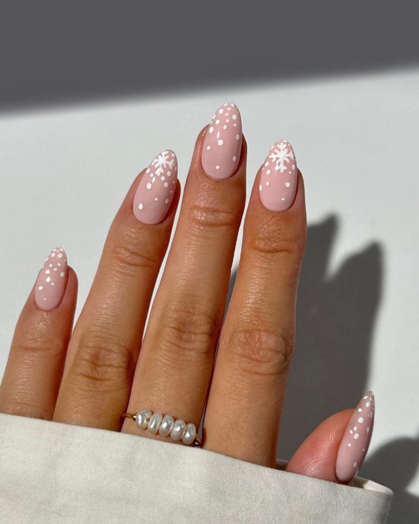 Like the first gentle snowfall of the season, this manicure feels calm, dreamy, and almost nostalgic. The soft pink base creates a romantic backdrop for simple white snowflakes and falling dots, making the whole design appear cute yet sophisticated. It’s the perfect idea for someone who loves understated elegance with just enough winter charm to feel festive.