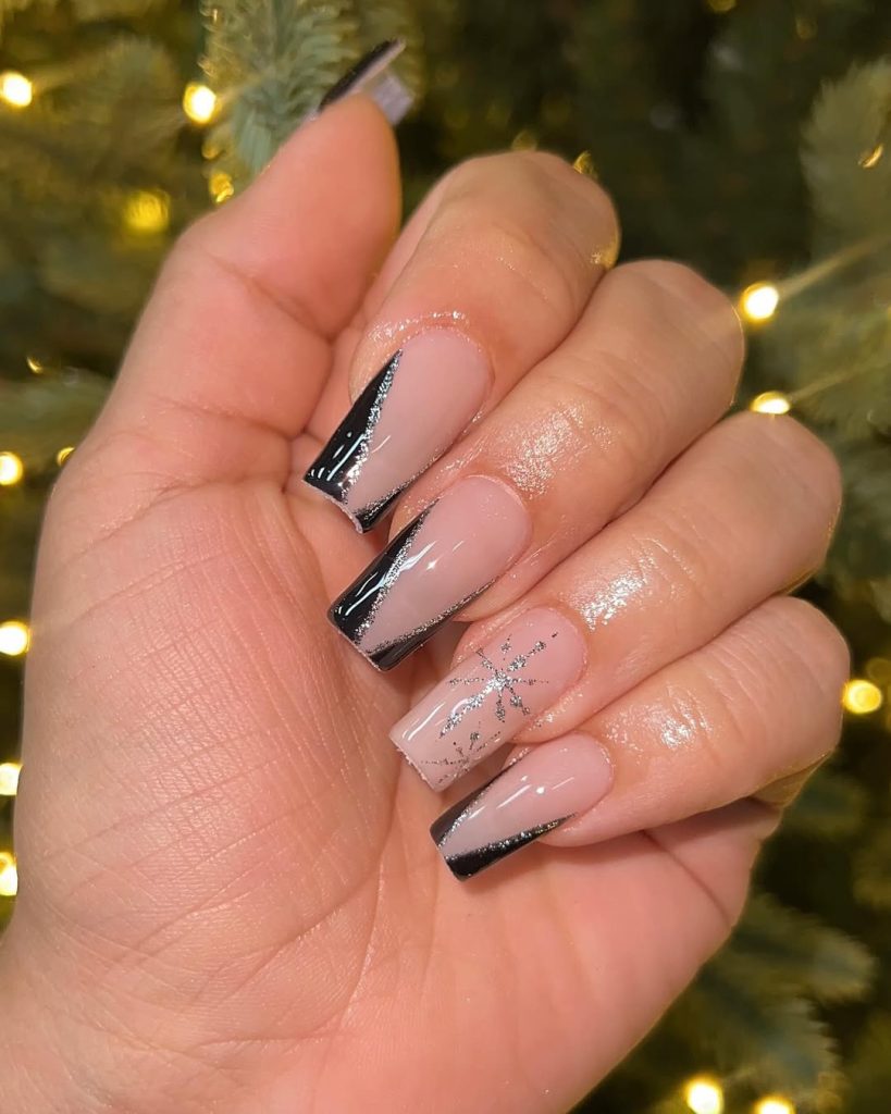 For those who want something a little edgier than traditional red or green, this look is pure winter sophistication. Nude bases are lifted with sharp black French tips edged in silver glitter, while a delicate snowflake sits gracefully on one nail. The contrast is striking, giving a chic twist that blends elegance with a slightly rebellious attitude.