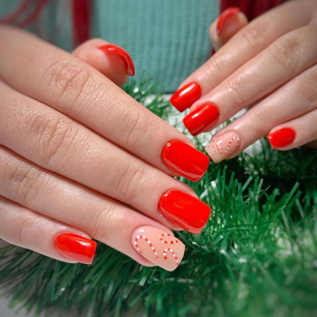 Few things feel more connected to Christmas than candy canes, and this design embraces that cheerful vibe. Bright glossy red nails make a bold statement, while a single nude accent nail decorated with a dotted candy cane brings in playful charm. The overall impression is both festive and simple, radiating warmth and joy without overwhelming the look.