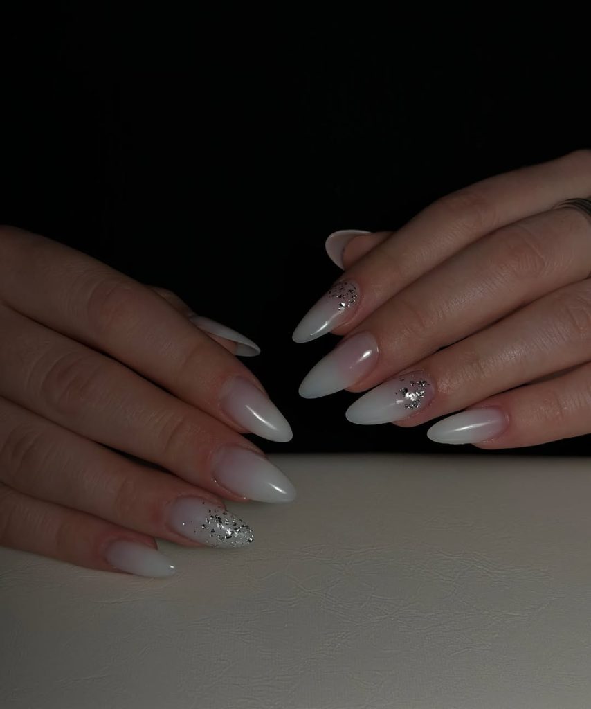 There’s something timeless about ombre nails, and this frosted white set feels like a snowy evening captured on your fingertips. The almond shape elongates the hand beautifully, while silver glitter accents add just enough sparkle to remind you of twinkling holiday lights. It’s an elegant and understated choice that radiates quiet confidence and festive charm.