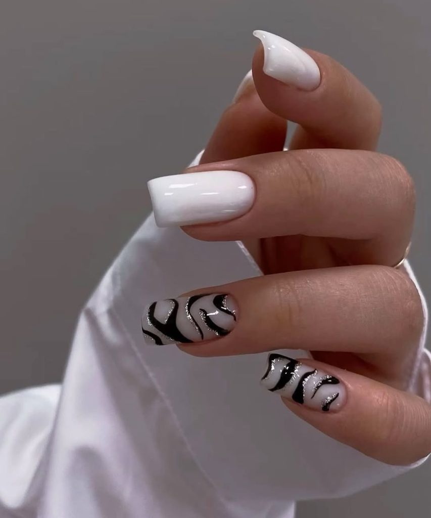 Classic white meets playful black swirls in this chic design, accented with touches of silver glitter that shimmer under the light. The combination feels both minimal and bold — an art-forward idea that proves winter nails don’t always have to be red or green to feel festive. With their crisp square shape, these nails bring a fashion-forward edge to the season.