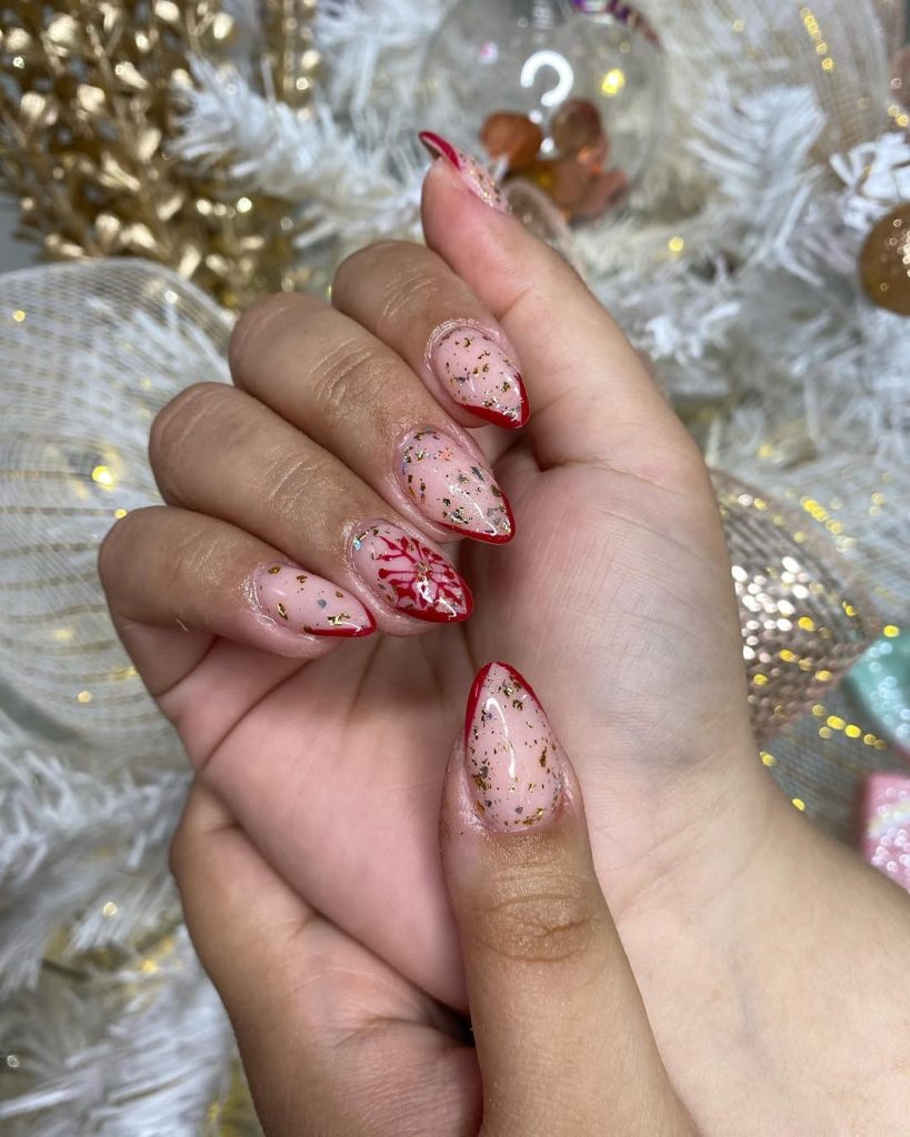 Festivity shines through in this almond-shaped manicure, where glossy red tips meet delicate gold leaf accents. The playful splashes of red art designs add a burst of energy while maintaining a classy sparkle red vibe. It feels joyful, spirited, and full of seasonal character — a look that embodies holiday magic in 2025.