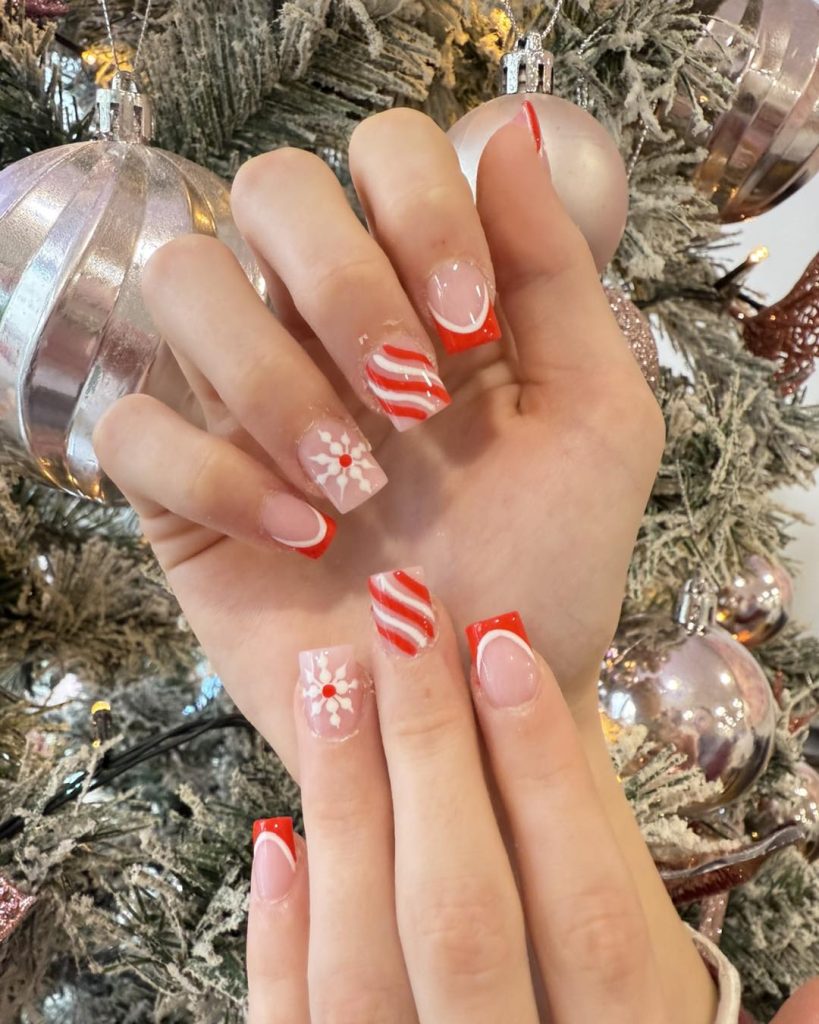 Whimsical and fun, these nails celebrate the sweetest part of Christmas with candy cane-inspired stripes and playful red tips. Paired with delicate snowflake art on a square base, this design feels festive yet polished, striking the balance between cute and classy. It’s a holiday manicure that immediately sparks joy and makes you want to reach for a peppermint latte.