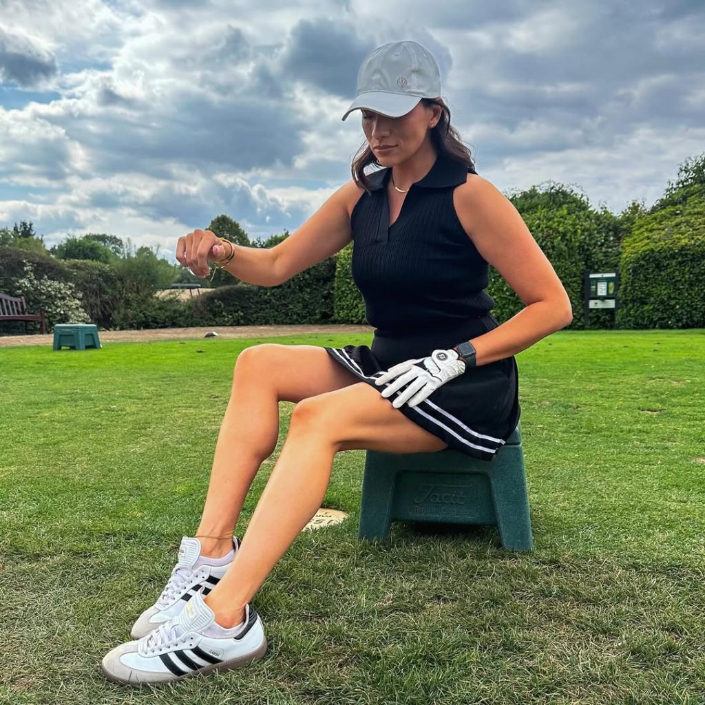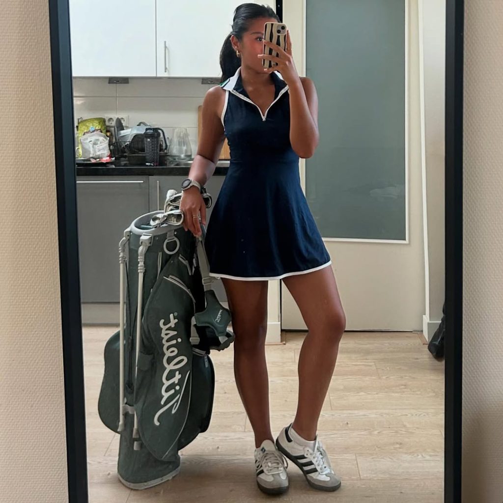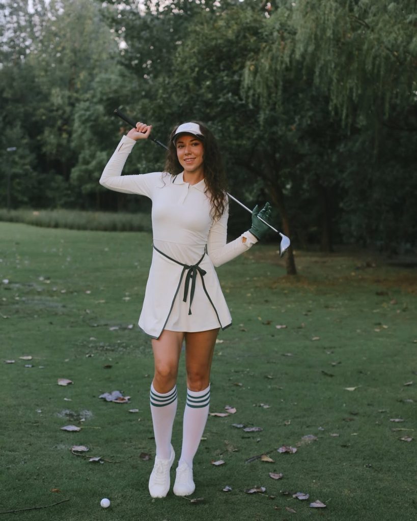 There’s a kind of quiet confidence in monochrome outfits—especially in white. It’s chic, fresh, and undeniably aesthetic, yet practical for warm climates and summer days when the course is bright and buzzing. I’d pair it with mirrored sunglasses or a minimalist belt bag. Avoid heavy layers—this look shines because it’s streamlined.