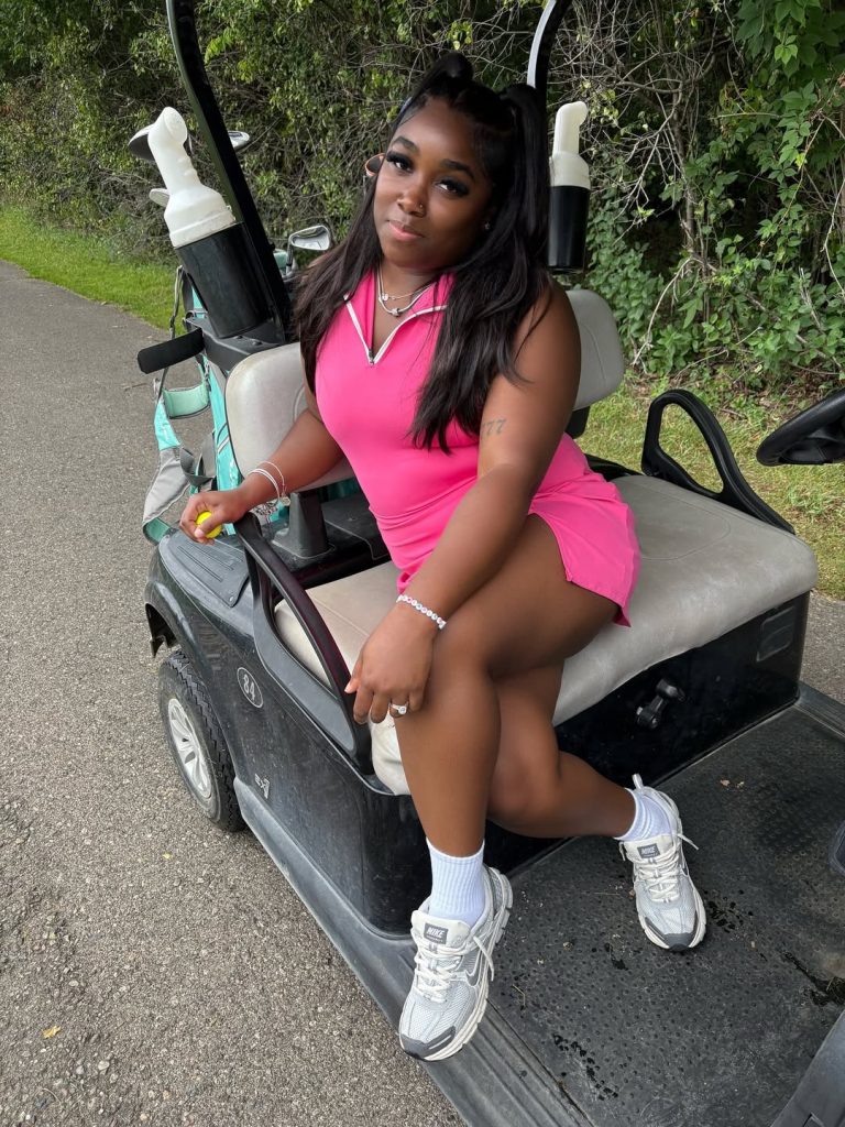 The outfit is a perfect blend of modernly performing activewear and country club chic. The bold athletic vibe of the outfit brings a polished edge to the entire look. The outfit is perfectly complemented by the confidence of a Black woman, truly elevating the course aesthetic.