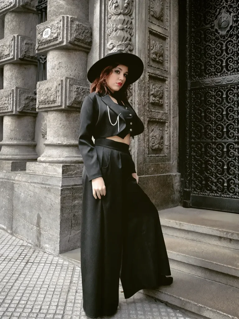 A sharply tailored two-piece set with wide-leg trousers and a cropped jacket, blending modern goth with clean architectural lines.