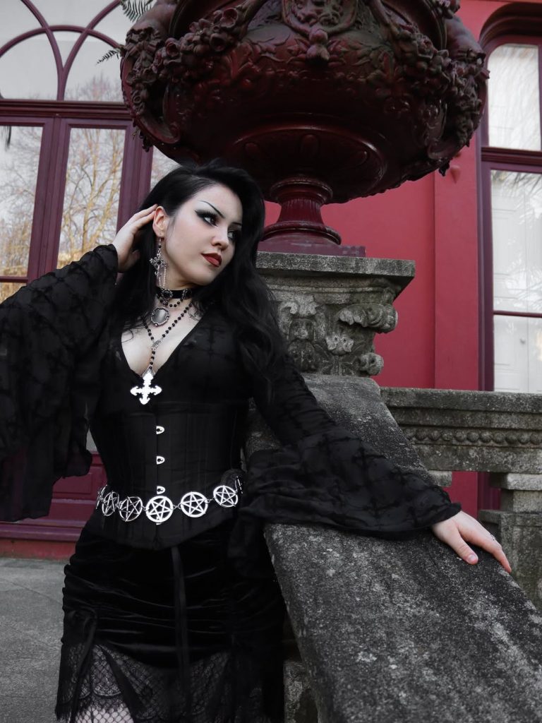 A dramatic corseted look with wide sleeves and bold jewelry channels unmistakable vampire glamour and moonlit drama.
