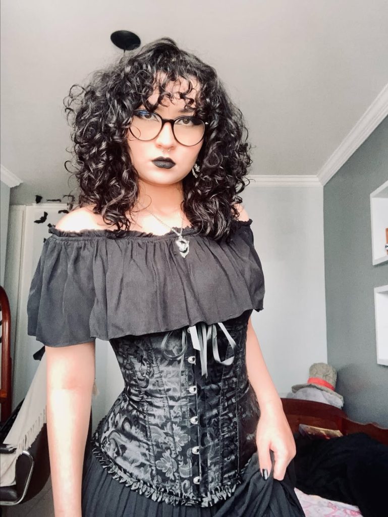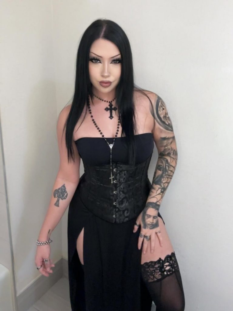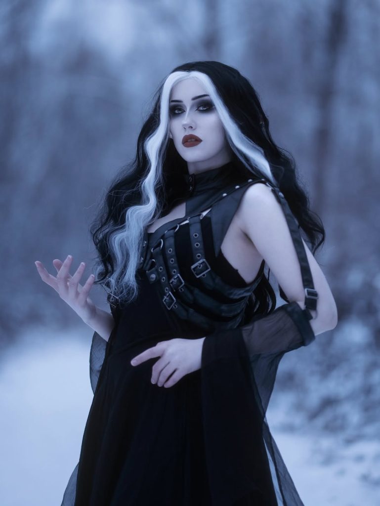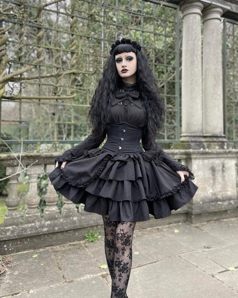 A tiered dress, corseted waist, and long curled hair evoke that classic doll-like goth silhouette with theatrical flair.