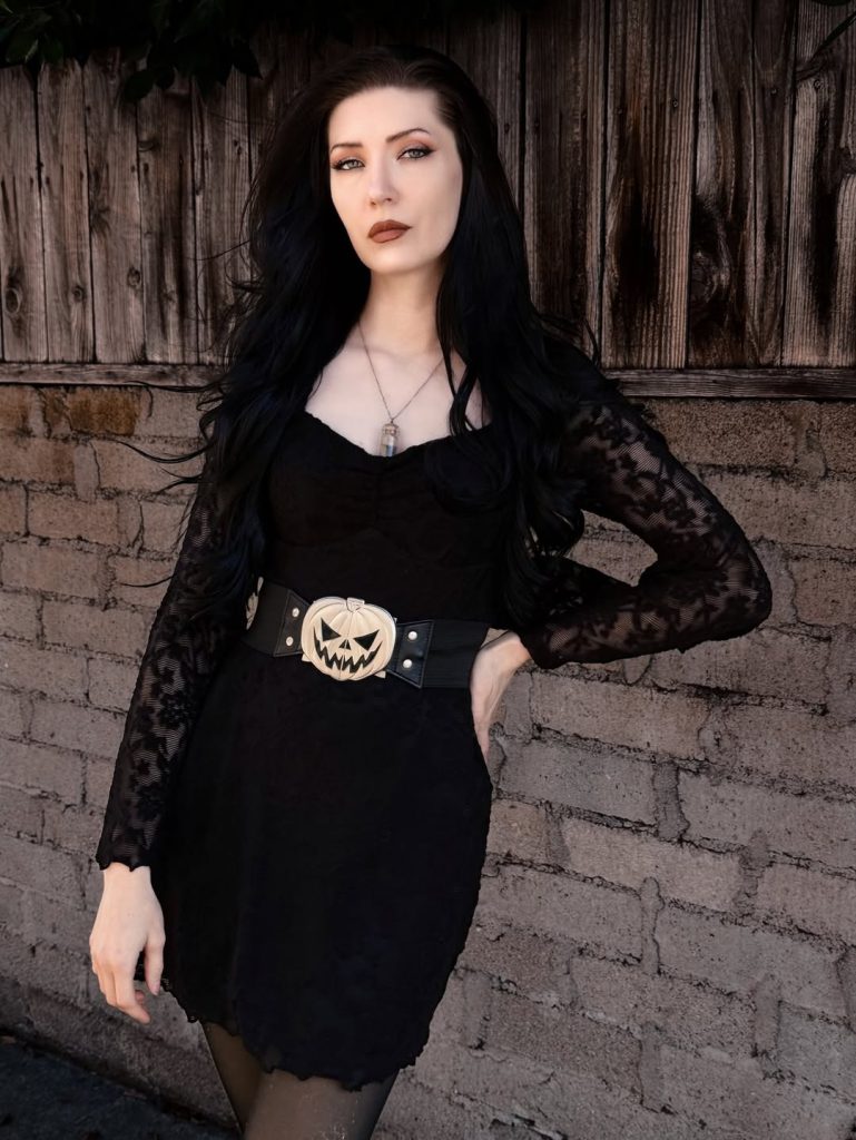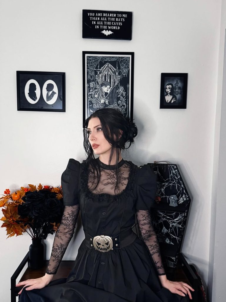 There’s a gentle romantic quality in the lace and soft neckline, reminding me of the classic goth girls who loved wandering antique stores on rainy afternoons. The pumpkin buckle adds a seasonal nod—perfect for fall or October events. To enhance the look, pair with subtle drop earrings or a soft-blend smoky eye. Avoid bulky bags; keep the silhouette fluid. Works beautifully for themed dinners, bookshop dates, or moody autumn photoshoots.