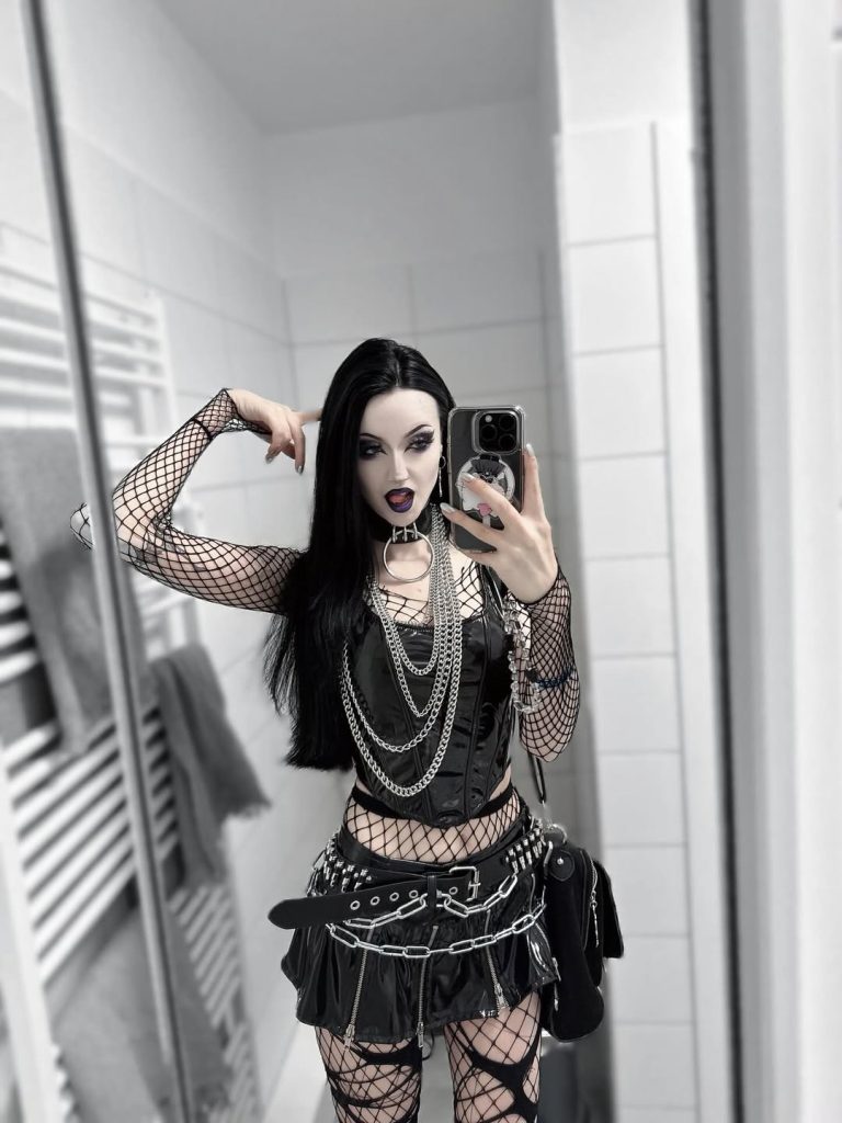 A mesh-sleeve corset look packed with chains, studs, and layered metal accents brings industrial goth style roaring into 2026.