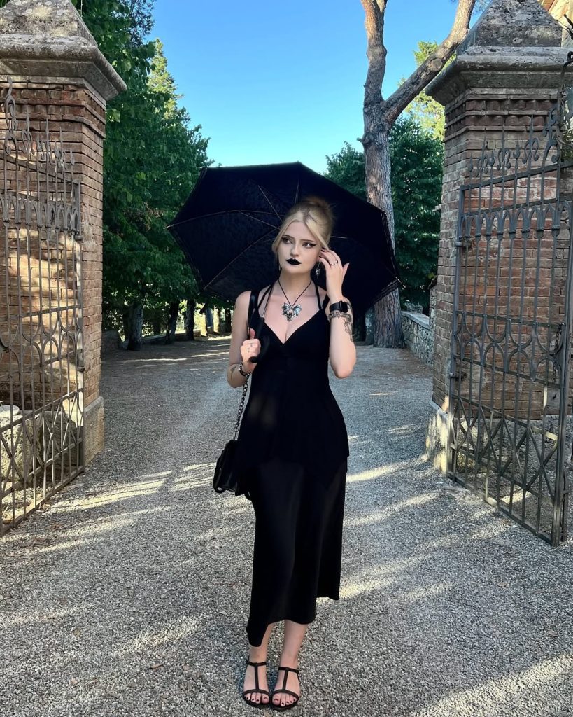 This is a perfect summer goth outfit—light, breathable, and striking without heat-heavy layers. Ideal for outdoor markets, daytime festivals, or historic garden strolls. Add a sheer shawl for a more Victorian touch, or keep accessories minimal for a simple, clean, modern silhouette. Avoid chunky footwear; the elegance lies in the outfit’s airy movement and soft drama. Great for travel, especially in sun-drenched locations where a parasol doubles as shade and style.