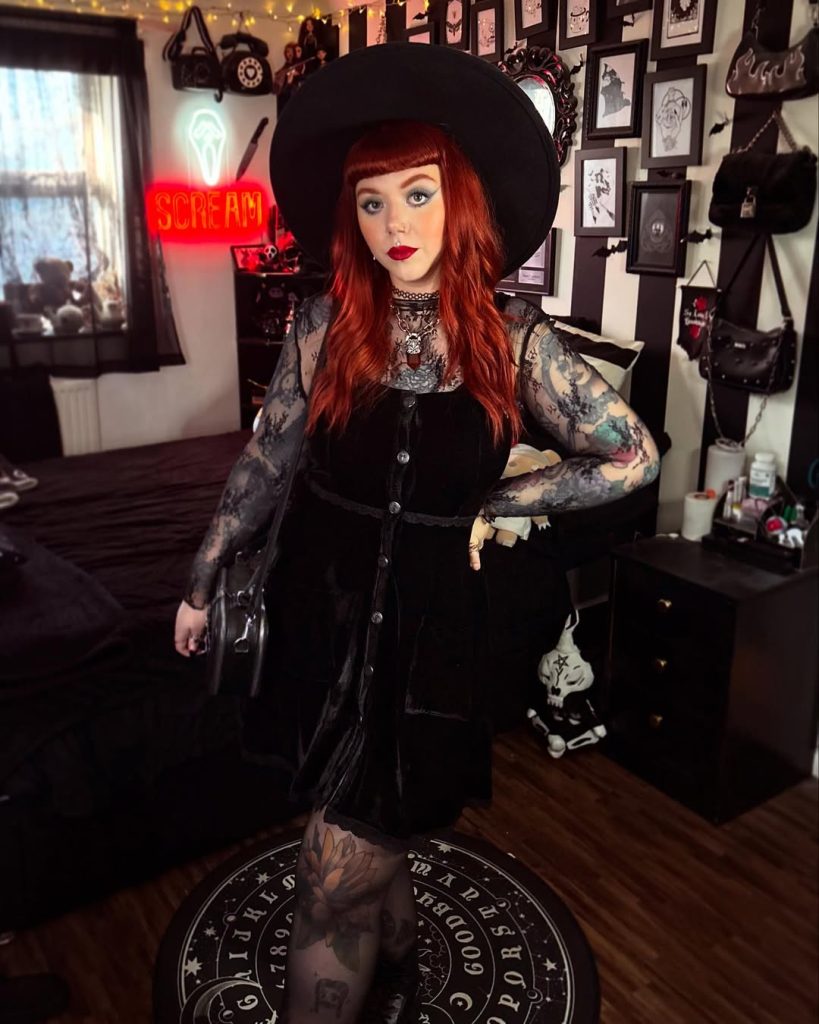 Soft velvet, sheer sleeves, and layered jewelry create a dreamy witch-inspired ensemble that feels both girly and bold.