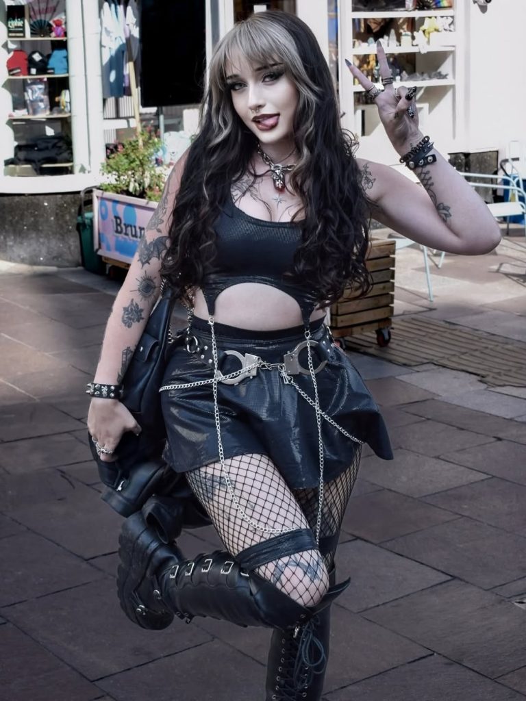This outfit feels like a flashback to early alt-club culture with a modern twist—perfect for nightlife, street photography, or edgy daytime shopping trips. Add platform boots or a cropped hoodie for colder weather. Avoid delicate accessories; bold metals make the look authentic. It’s the ideal pick for anyone who loves high-impact goth fashion that blends aesthetic flair with raw, rebellious energy.