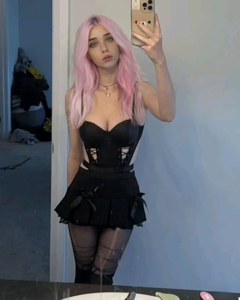 A pink-haired pastel goth look paired with a black corset mini-dress blends sweetness with shadow in a refreshing 2026 twist.