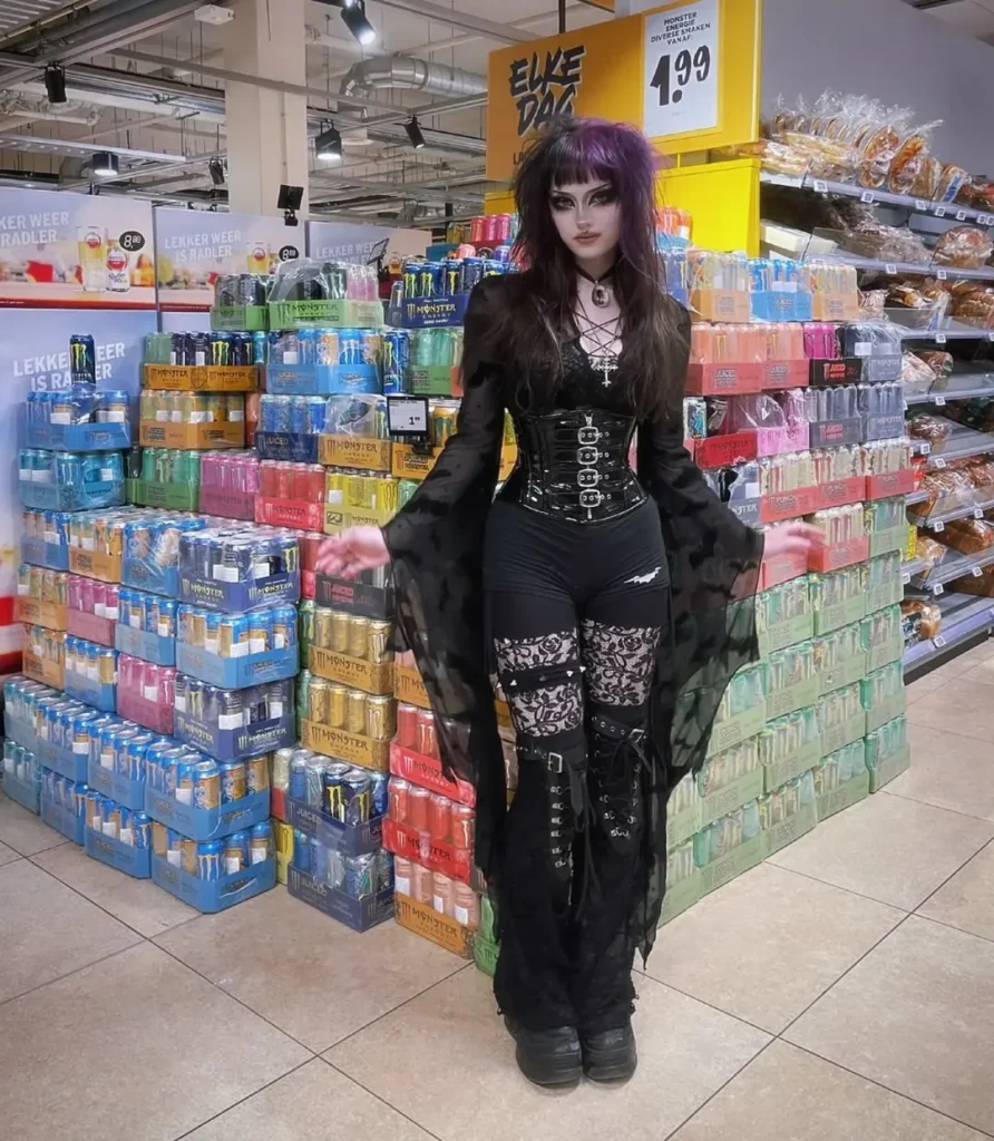 This outfit has that electrifying street-market vibe—perfect for summer festivals, downtown nights, or casual mall runs with a dark twist. The mixture of textures gives it grunge, aesthetic, and slightly Y2K energy. Add fingerless gloves for more edge or a cropped leather jacket for cooler weather. Avoid delicate jewelry; bold metal completes the look. This is a great choice for anyone who loves high-impact goth fashion that still feels fun and expressive.
