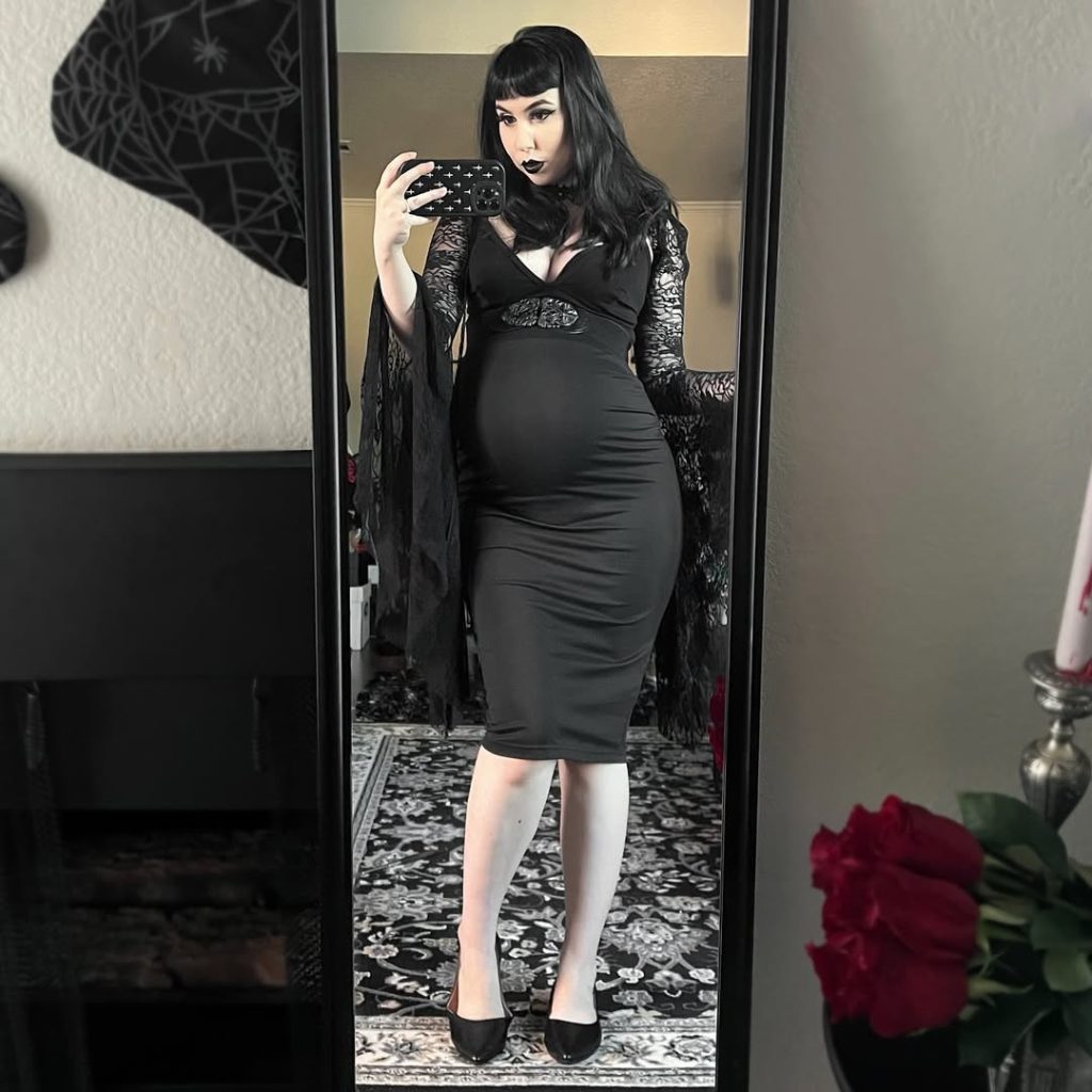 A fitted black dress with lace bell sleeves creates an elegant maternity goth look that balances structure, comfort, and dramatic detail.