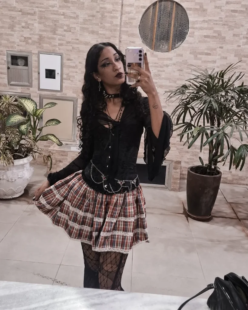 This reminds me of the outfits I used to spot near alternative record stores—a little rebellious, a little for school, and a lot expressive. To amp up the aesthetic, add a small crossbody bag with metal detailing or layer thin silver rings. Avoid shoes that feel too sporty; they break the mood. A great choice for autumn festivals, casual photoshoots with friends, or browsing indie clothing shops at the mall. The plaid gives it a soft 90s nostalgia, while the lace keeps everything anchored in goth tradition.