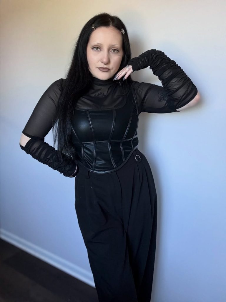 Structured black trousers and a mesh-and-corset top create a thoughtful blend of softness and strength—modern goth minimalism at its best.