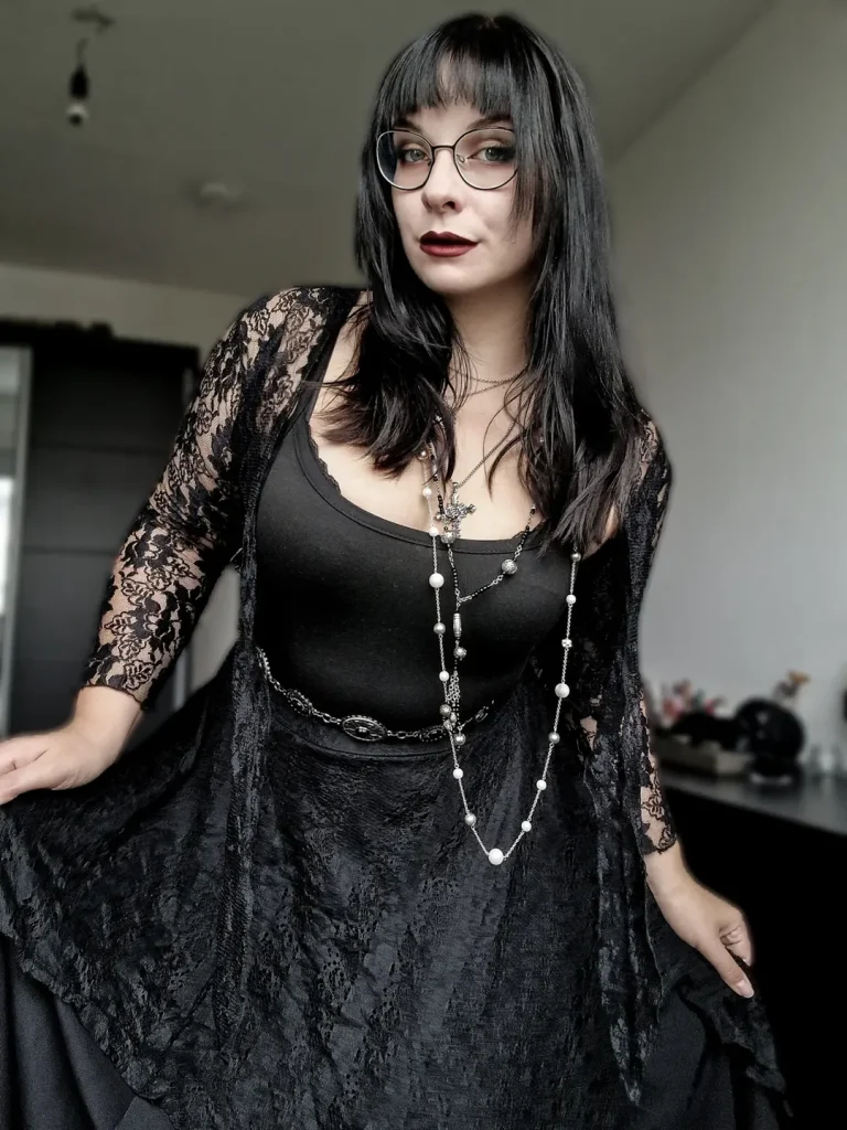 Soft lace, a flowing skirt, and long layered necklaces create a romantic goth silhouette full of texture and charm.