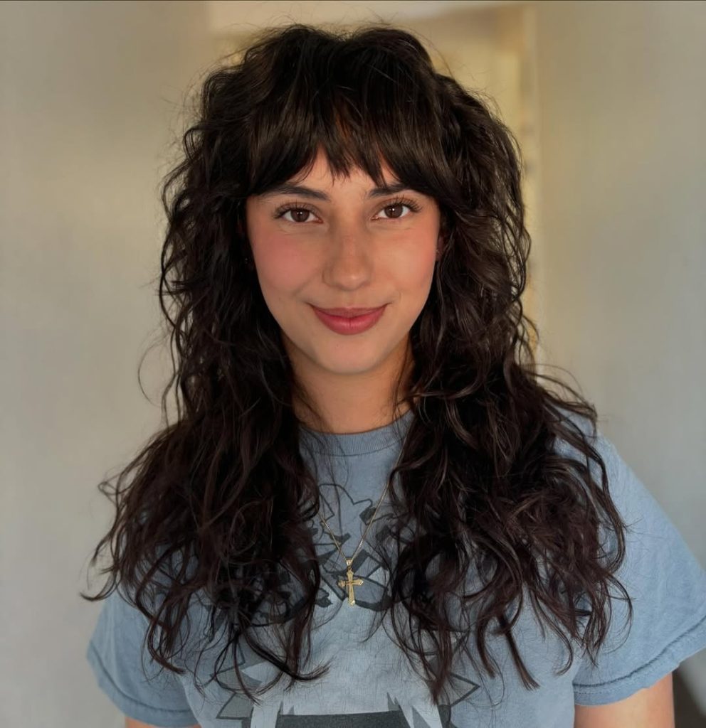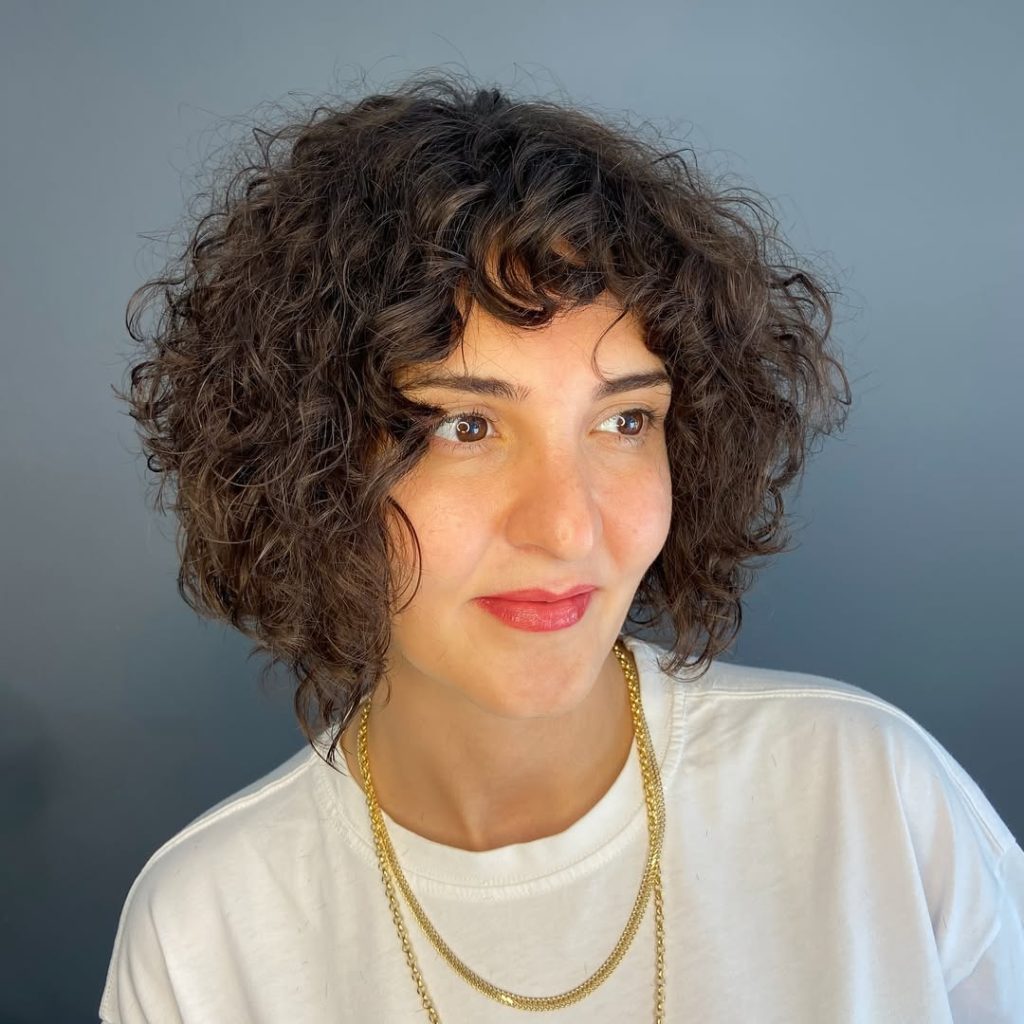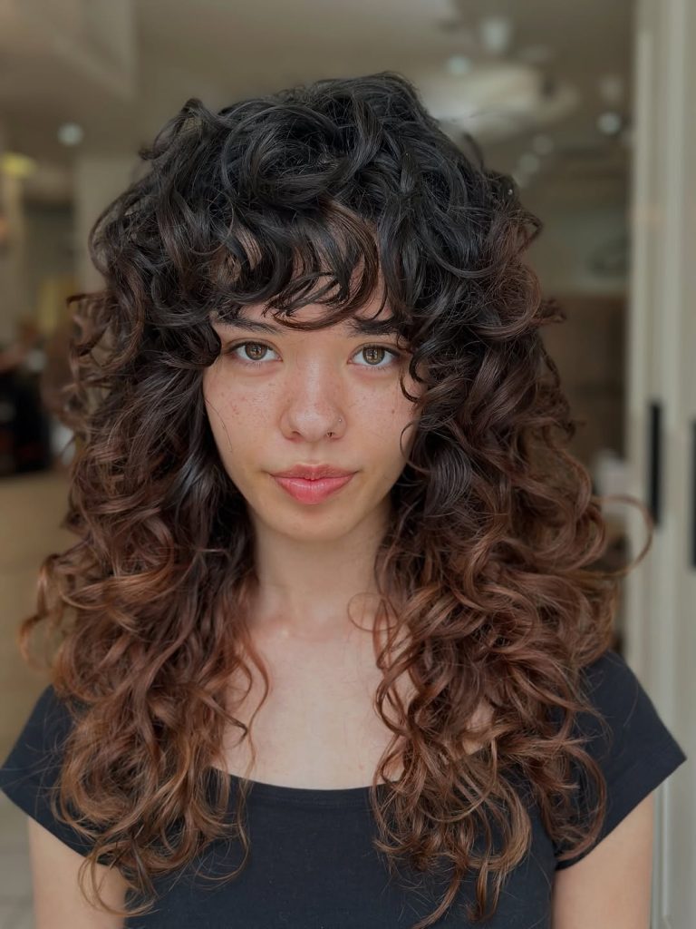 This haircut celebrates natural texture in the most beautiful way. The curls are full, lively, and expressive, creating a striking frame around the face. The soft Bangs blend into the curls, adding a playful softness while enhancing the overall volume. It’s the kind of hairstyle that instantly feels confident and full of personality.