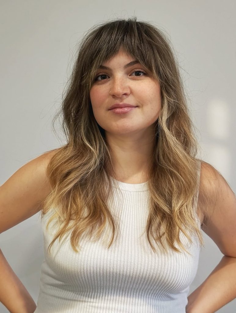 This haircut has a relaxed, slightly retro charm that feels incredibly modern right now. The soft waves fall naturally through the mid-length layers, while the wispy bangs draw attention to the eyes and soften the overall shape. The look feels playful and stylish without ever appearing overly styled.