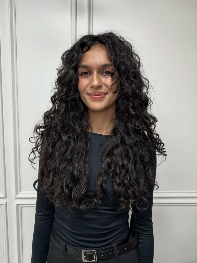 This hairstyle has that effortless, joyful energy that comes from letting natural curls truly shine. The long waves cascade softly down the shoulders, creating movement and dimensions that feel both elegant and relaxed. There’s a warmth to this look—the kind of style that feels approachable, confident, and completely authentic.