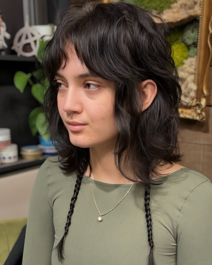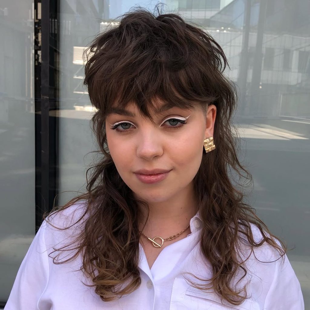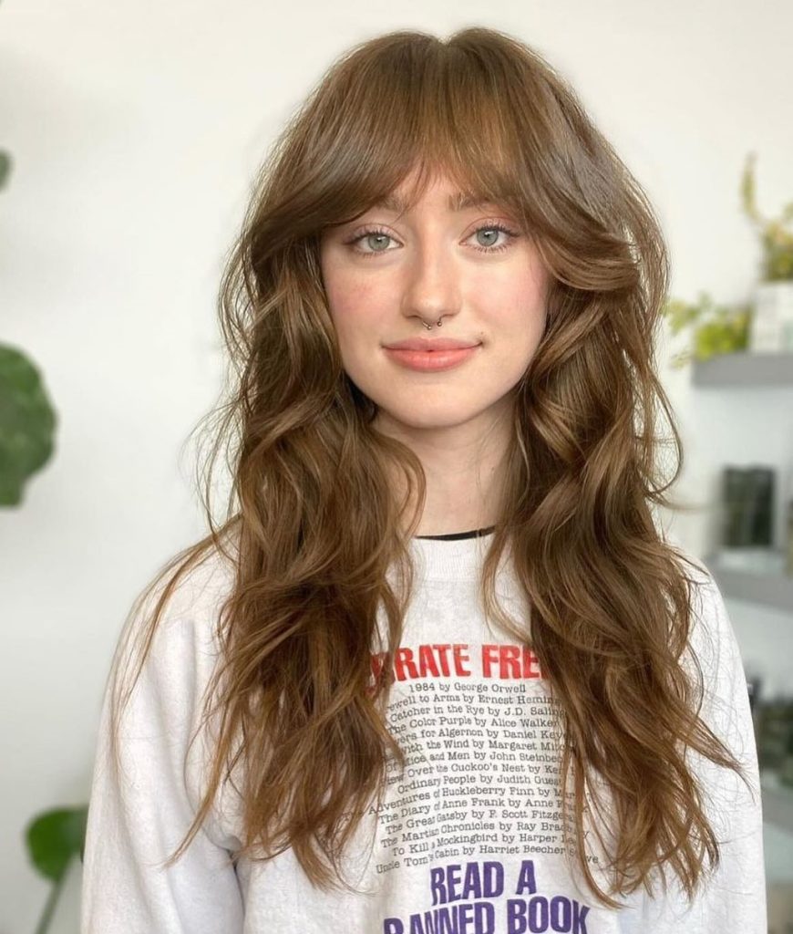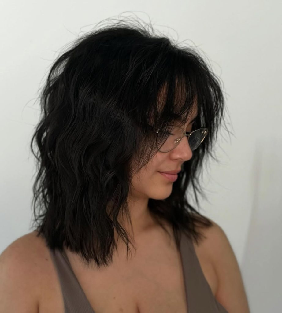 There’s something wonderfully expressive about a textured shag like this. The softly tousled waves give the hair a playful, slightly rebellious energy, while the bold Bangs create a striking focal point around the eyes. The layered shape feels modern and artistic, as if the hairstyle carries its personality. It’s the kind of cut that instantly gives wavy hair movement and attitude.