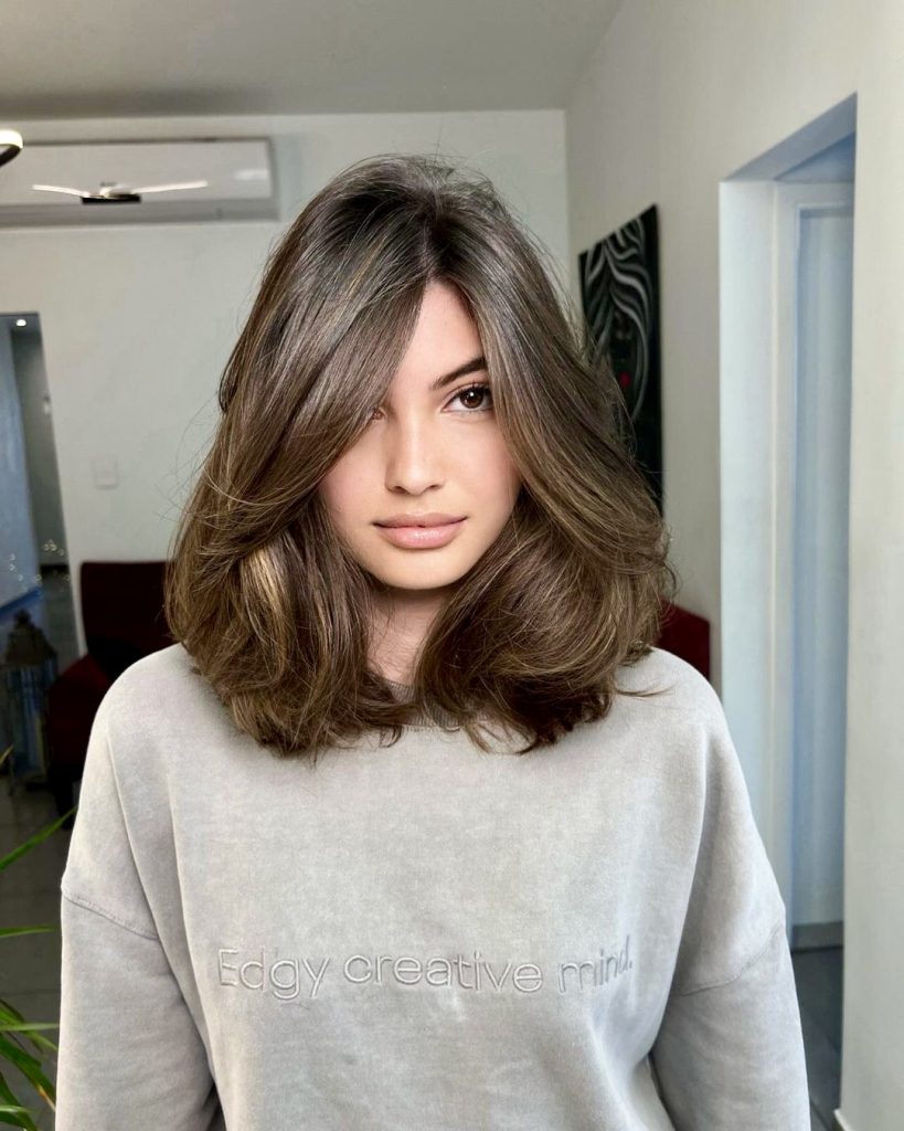 This full and layered hairstyle gives an oval face natural volume while soft curtain bangs touch the eyebrow line. Long sectioned hair with dimensional brunette coloring moves the style naturally and keeps the locks feeling lightweight. The easy feminine look suits women who want to move away from flatness and bulk at the hair ends.