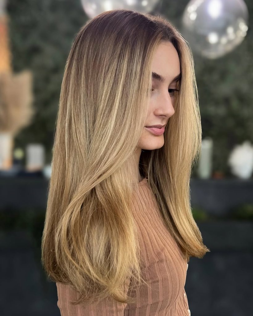 This look is perfect for straight or slightly wavy hair, as the layers bring movement without overwhelming the sleekness. It’s especially flattering on long hair, and the darker undertone at the roots makes it a low-maintenance choice. A shine serum is the finishing touch to keep it polished.