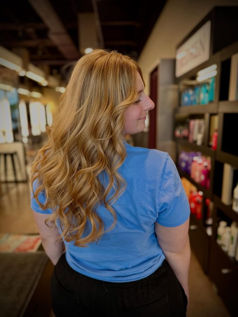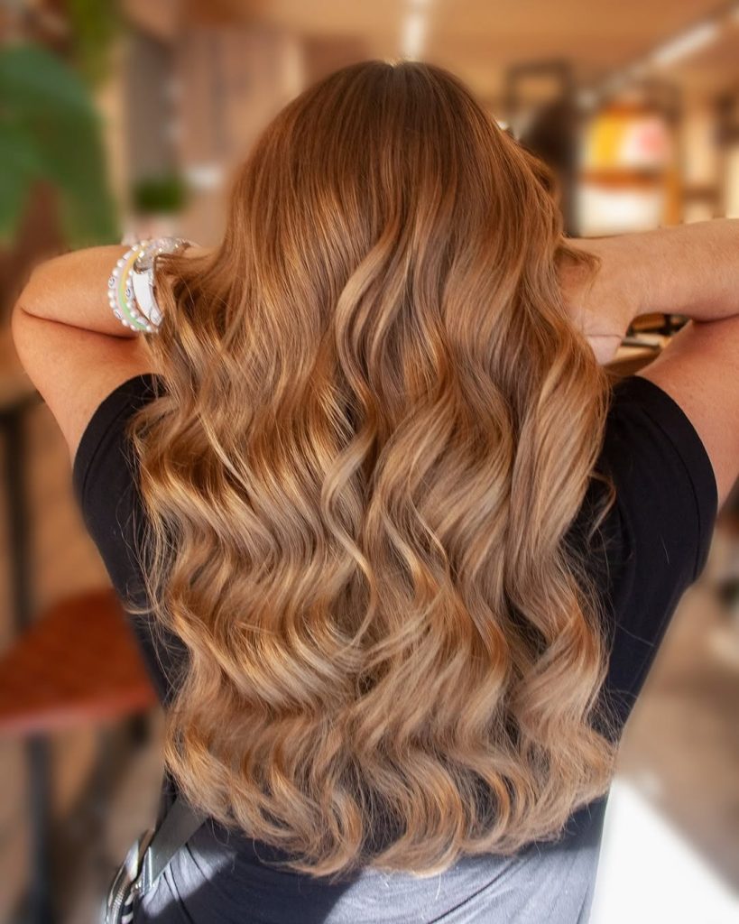 This honey blonde style has a subtle elegance thanks to its fine, multi-tonal dimension. The waves look soft and flowing, giving the hair a natural bounce that’s both sophisticated and easy to wear. It’s a timeless, versatile color that works year-round.
