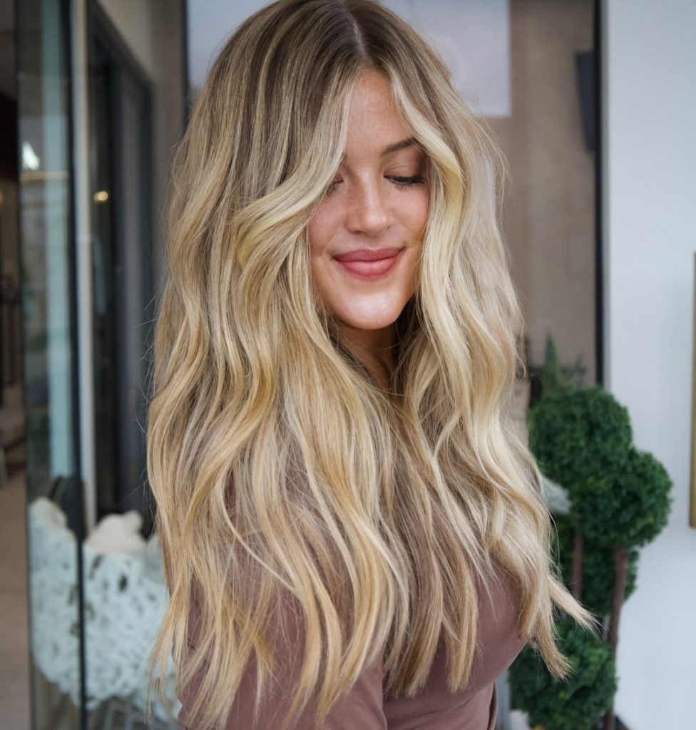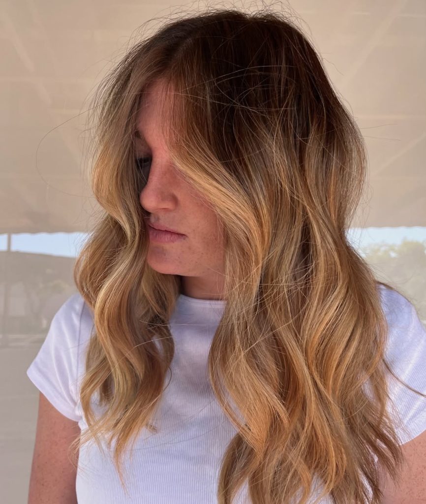 This honey blonde style blends dark roots with bright golden ends, creating a dimensional effect that’s modern and chic. The flowing waves amplify the depth of color, making the hairstyle look full and voluminous. It’s glamorous yet grounded, the kind of inspo that turns heads.