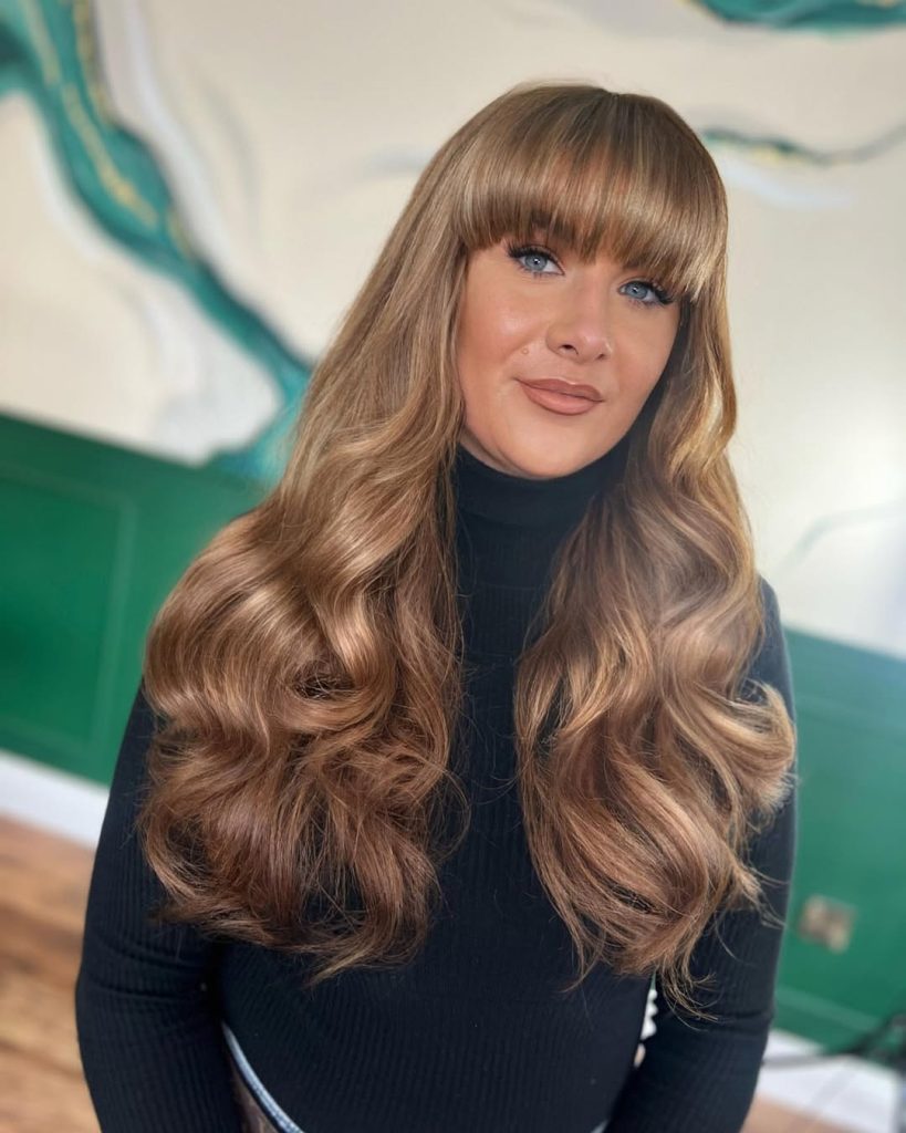 There’s no denying the impact of honey blonde hair paired with a full, face-framing fringe. The color has a golden richness that makes the cut feel modern while still keeping it soft and feminine. It’s a playful yet elegant choice, perfect for women looking to add a little drama to their everyday style.