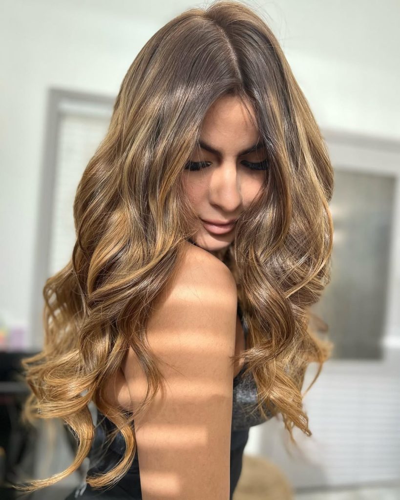 If your hair is naturally darker, this dye formula is a great way to brighten up without going too light. The soft honey tones layered over a brown base make it versatile for curly or straight textures. It’s a low-maintenance option too, since the root depth allows for easy grow-out while still looking stylish.
