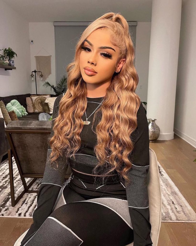 It’s a stunning choice for dark skin women who want a lighter, bright look that enhances their natural glow. The ponytail style is versatile too—great for nights out or casual weekends. For upkeep, a heat protectant is key when styling, ensuring the waves stay healthy and shiny.