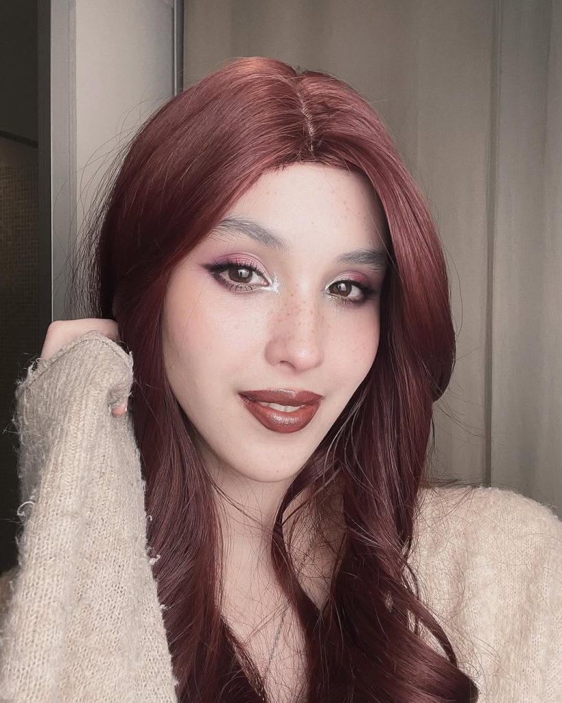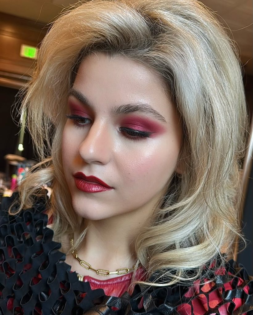 This look feels unapologetically glamorous, like stepping into a late-90s fashion editorial where confidence comes first. The rich red eyeshadow instantly creates drama, but the clean skin and softly defined lips keep it from feeling overdone. There’s a cinematic quality here—very trends-driven, but with the timeless allure you’d expect from old-school beauty ads. It’s bold, sensual, and surprisingly elegant.