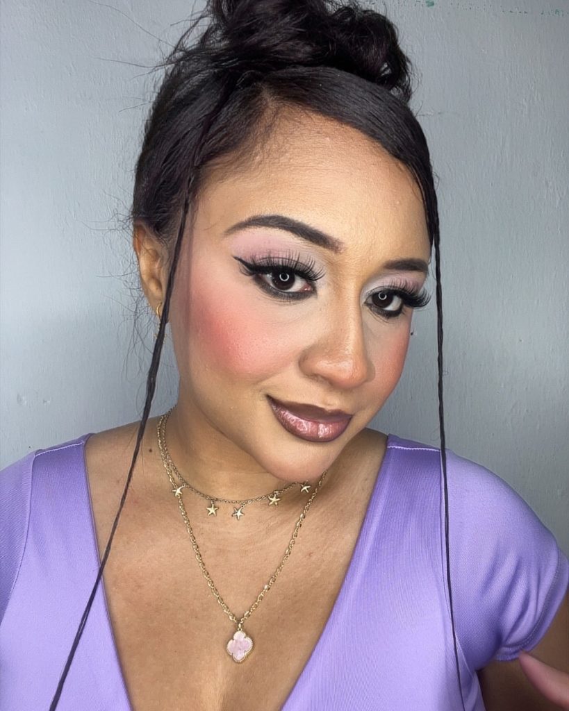 This look feels playful, confident, and very hoochie mama in the best way. The lifted winged liner combined with bold pink blush instantly recalls 90s pop beauty, with a subtle nod to hip hop and Bollywood influences. It’s fresh, fun, and full of personality—perfect for anyone who misses makeup that wasn’t afraid to be seen.