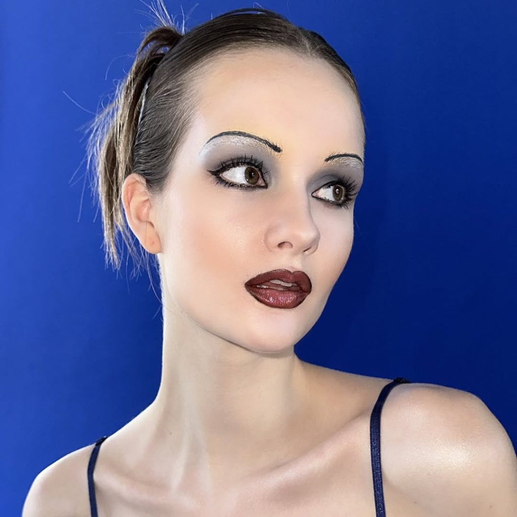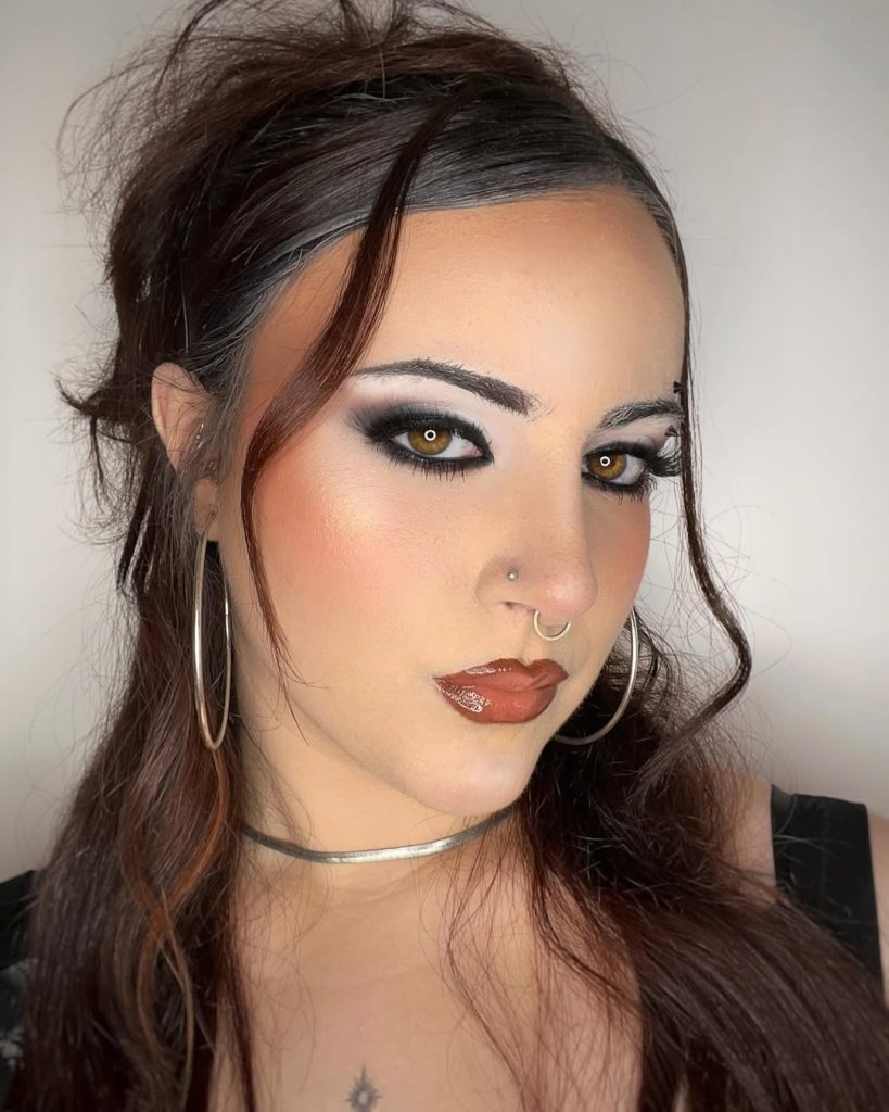 There’s something undeniably powerful about this look—it carries the confidence of early runway makeup and the drama of late-night club culture. The smoky taupe eyeshadow feels straight out of the 90s, paired with deep, glossy lips that recall iconic grunge moments and high-fashion editorials. It’s bold but controlled, with a clean base that lets the eyes and lips do all the talking. This is the kind of inspiration that feels grown, not loud.