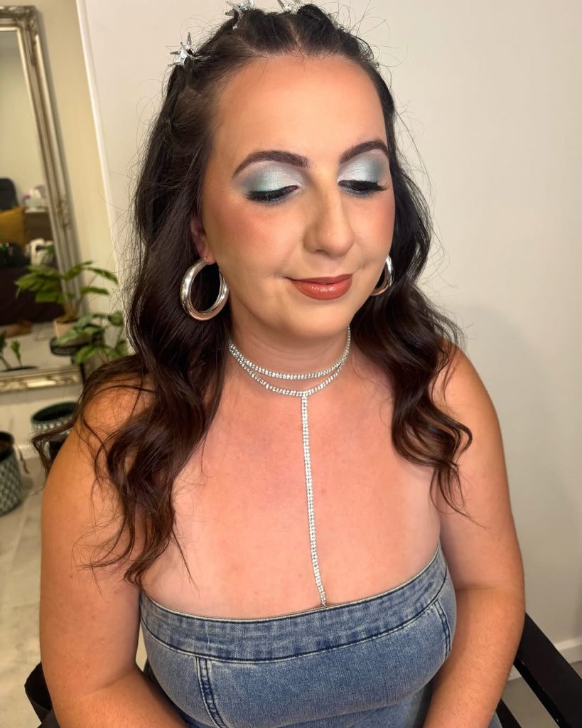 This look feels glamorous but approachable, blending metallic shimmer with soft, neutral tones. The eyes catch the light beautifully, giving a subtle nod to 90s party makeup, while the nude lips keep everything grounded and elegant. It’s the kind of aesthetic that feels celebratory without being overwhelming.
