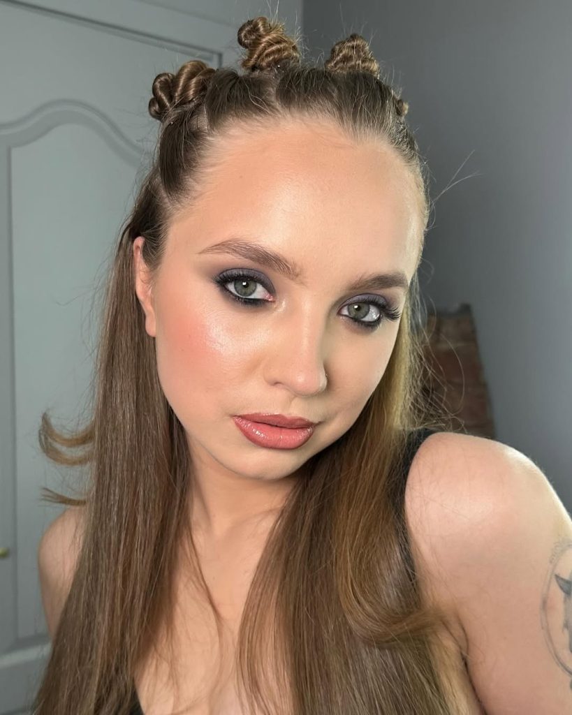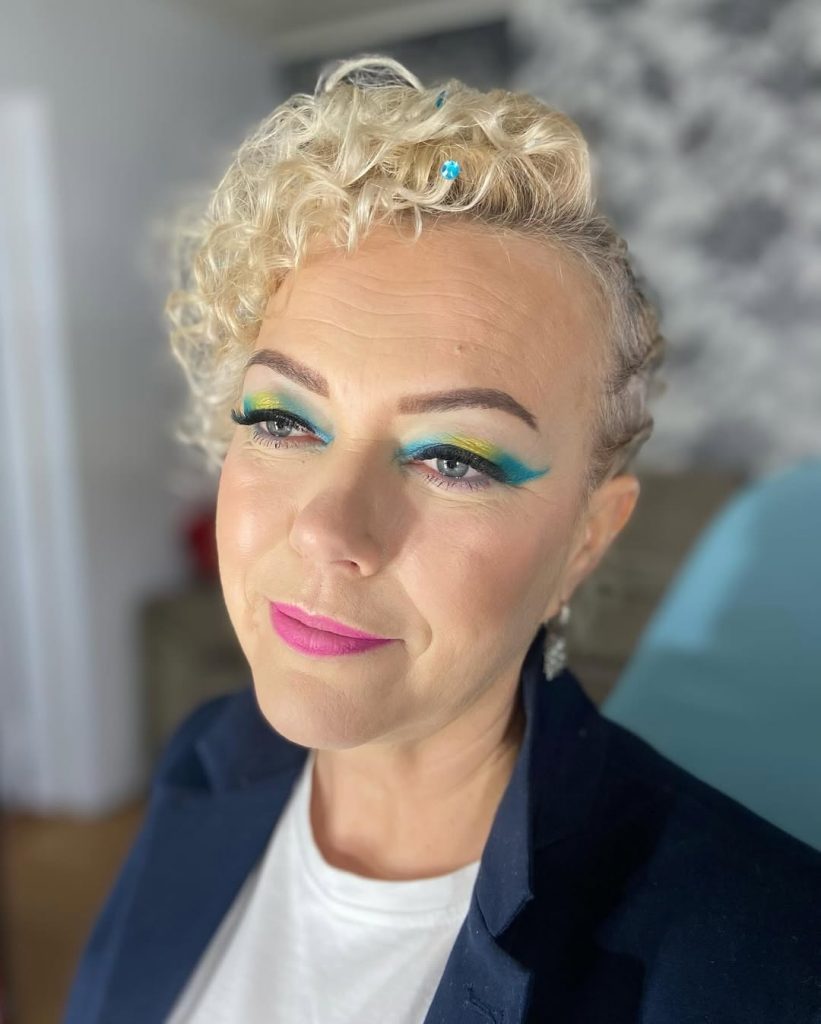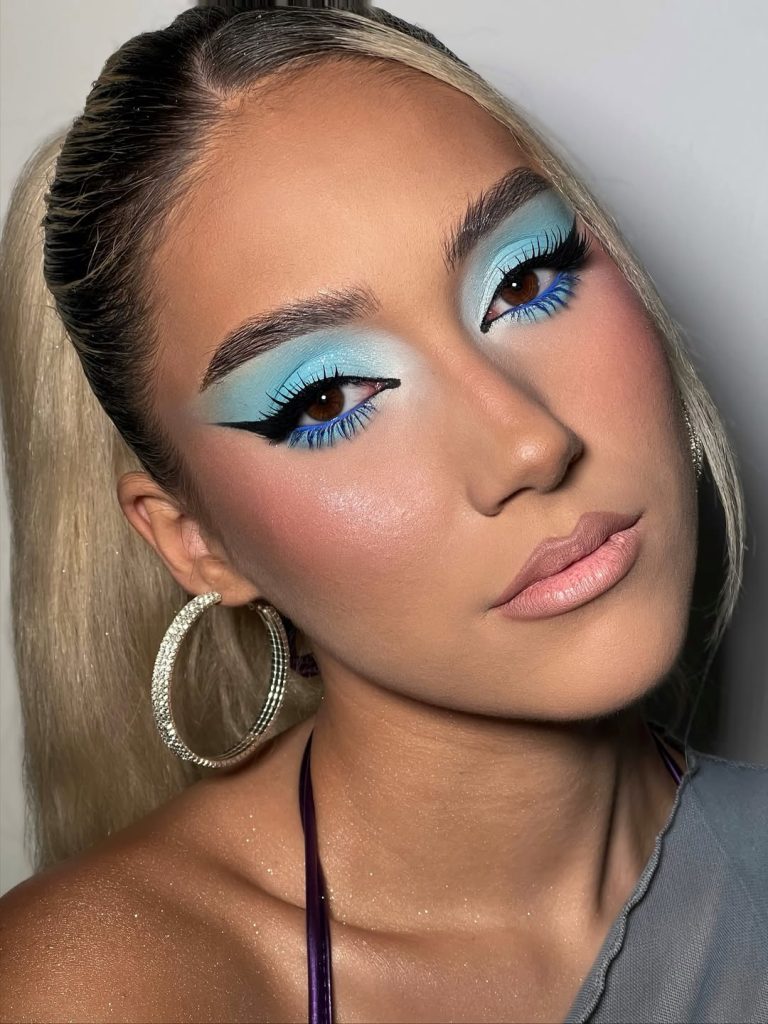This look is pure inspiration—fun, confident, and joyfully nostalgic. The bright blue eyeshadow instantly transports you back to early 90s pop culture, when makeup was expressive and personal. Paired with a soft lip and glowing skin, it feels cheerful rather than overwhelming. It’s the kind of aesthetic that reminds you beauty doesn’t always have to be serious.