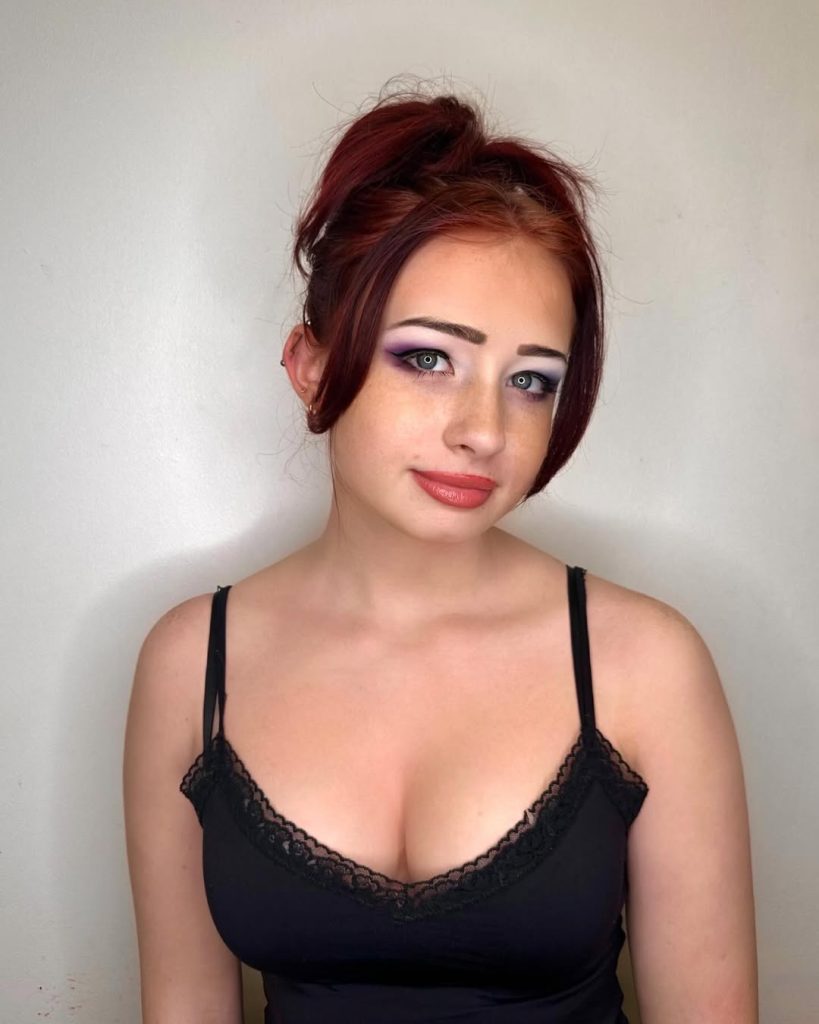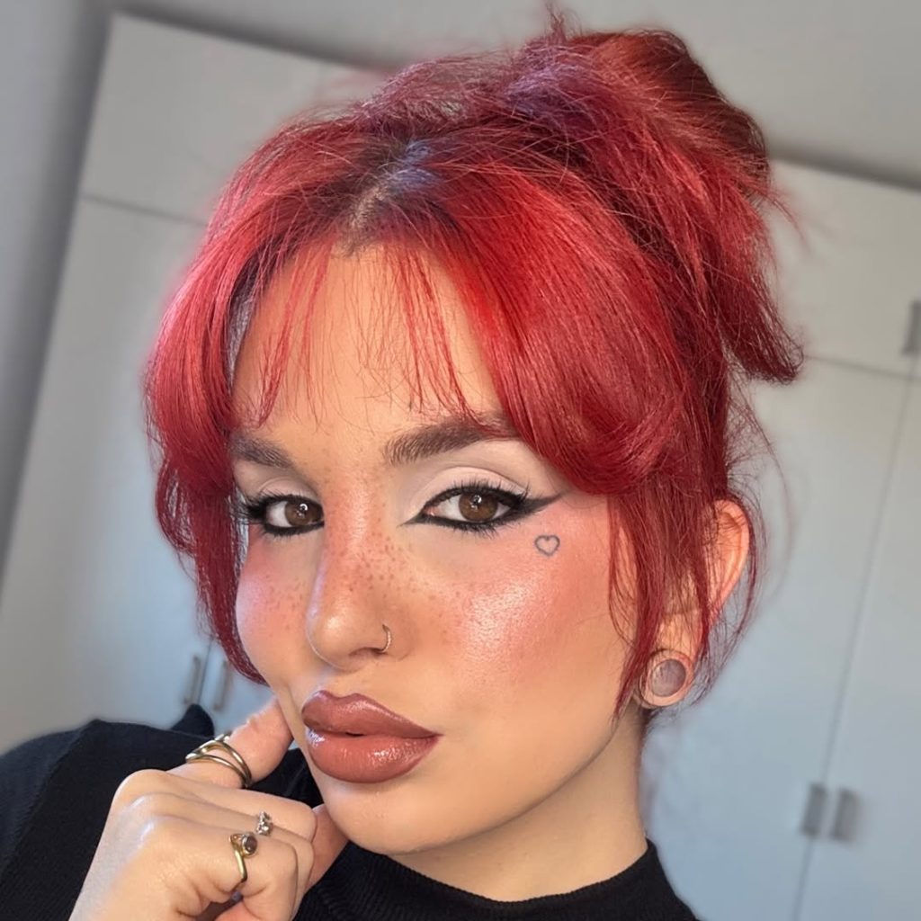 This look feels bold, flirty, and very late 90s in the best way. The cherry red hair instantly adds personality, while the crisp winged liner brings in that unmistakable 90s edge. Freckles, flushed cheeks, and glossy lips soften the overall aesthetic, making it feel playful rather than severe. It has that confident, self-made vibe you’d expect from underground beauty inspo rather than polished ads.
